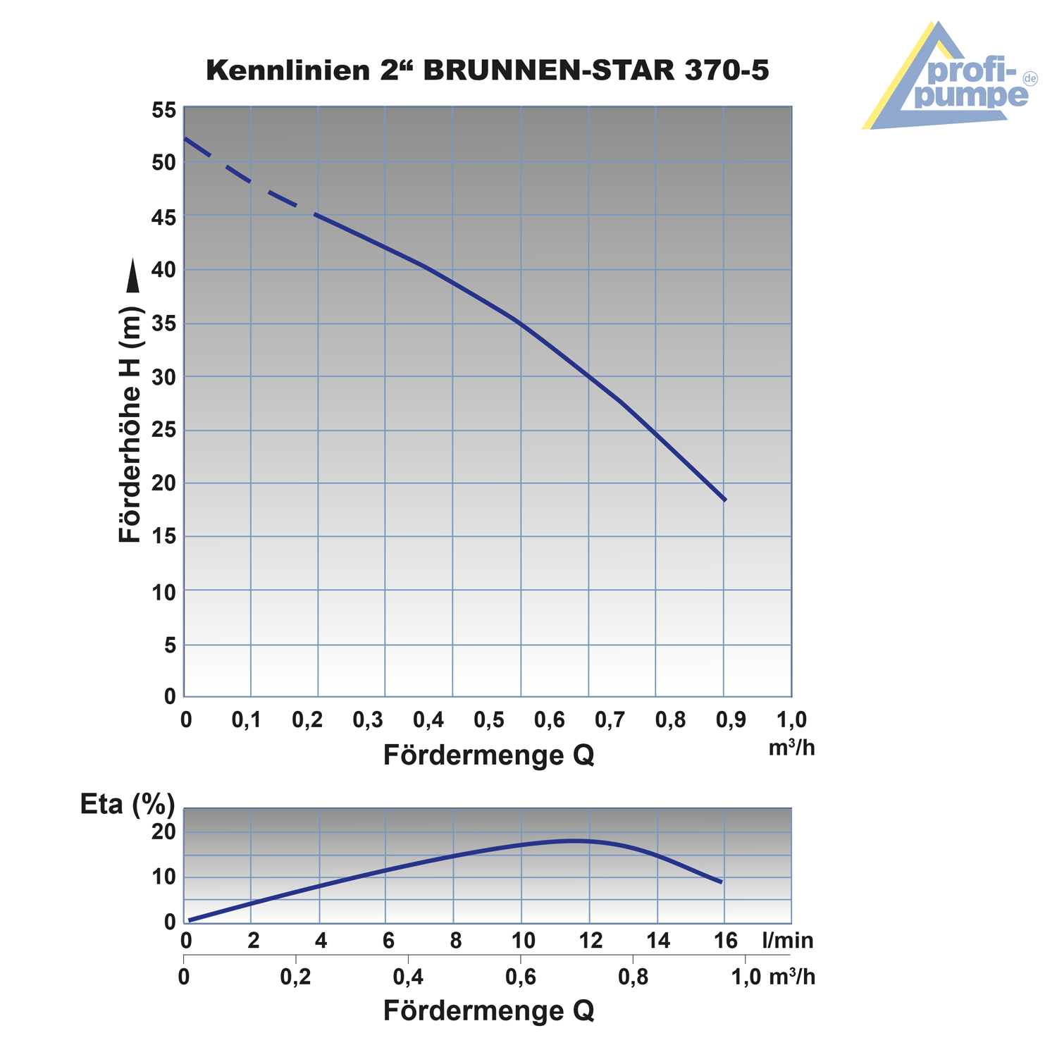 Die maximale Fördermenge dieser schmalen Tiefbrunnenpumpe beträgt 16 l/min (0,96cbm/h), die maximale Förderhöhe 51m und der maximale Förderdruck 5,1 bar. Bitte beachten Sie, dass die Förderleistung bei steigender Förderhöhe entsprechend abnimmt.
