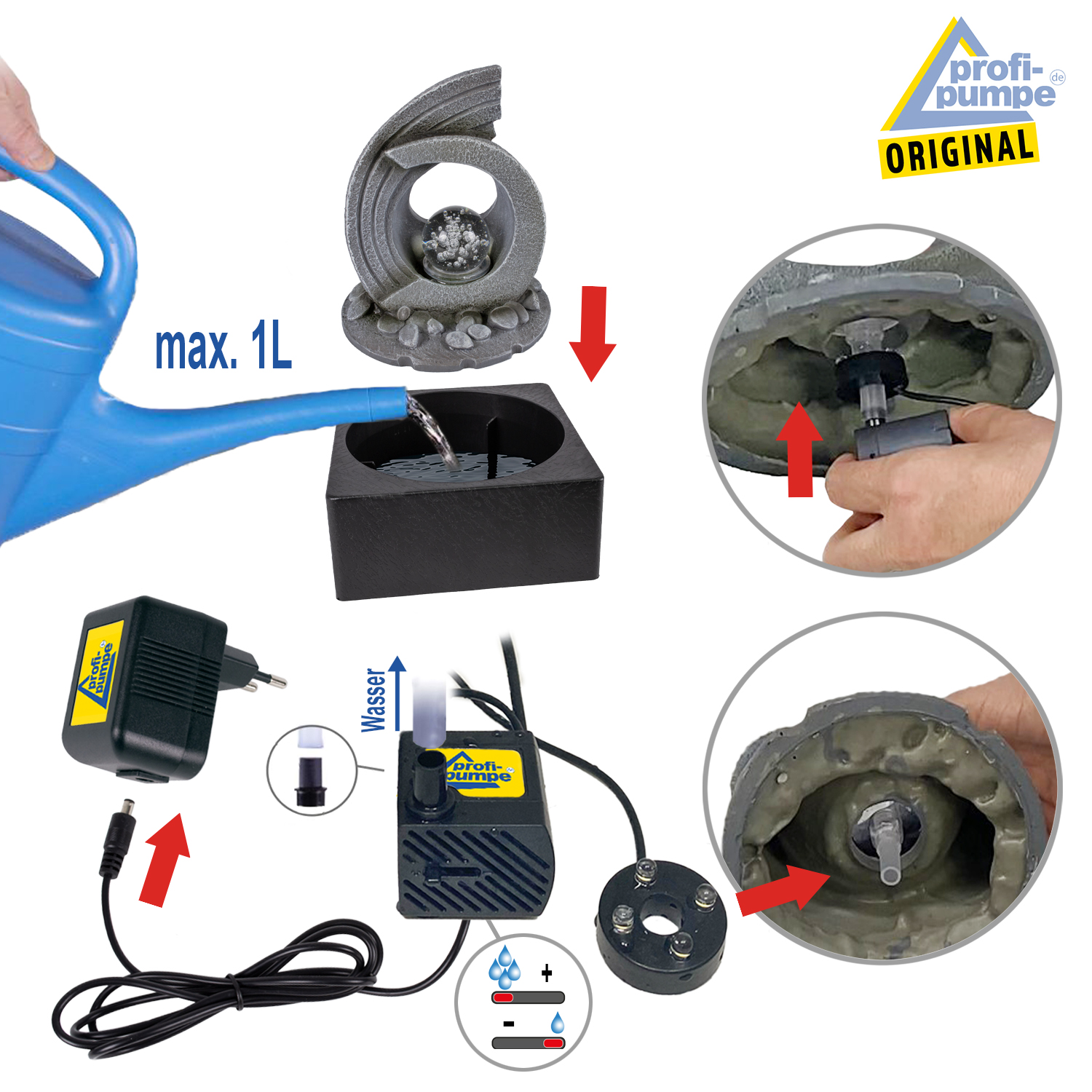 Der Wasserbrunnen ist für den 230-Volt-Betrieb vorgesehen. Die Pumpe und die LEDs werden mit sicherer 12V-Niederspannung betrieben (Adapter im Lieferumfang enthalten). Alle Kabelverbindungen sind verpolungssicher, wasserdicht und absolut funktionssicher. Dank praktischer Steckverbindungen sind alle Komponenten jederzeit austauschbar. So können Sie den Wasserbrunnen mit der effektvollen LED-Beleuchtung und das fließende Wasser jahrelang genießen!