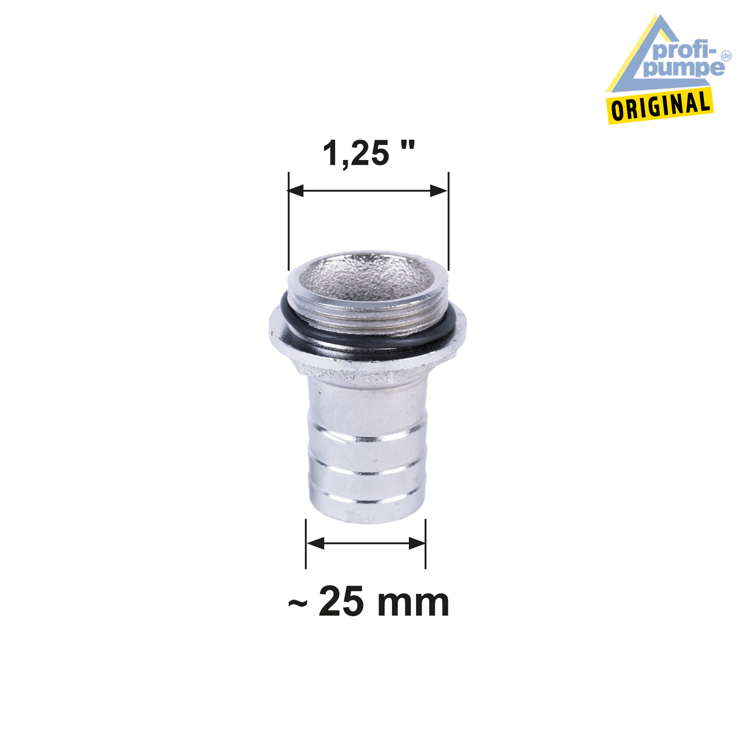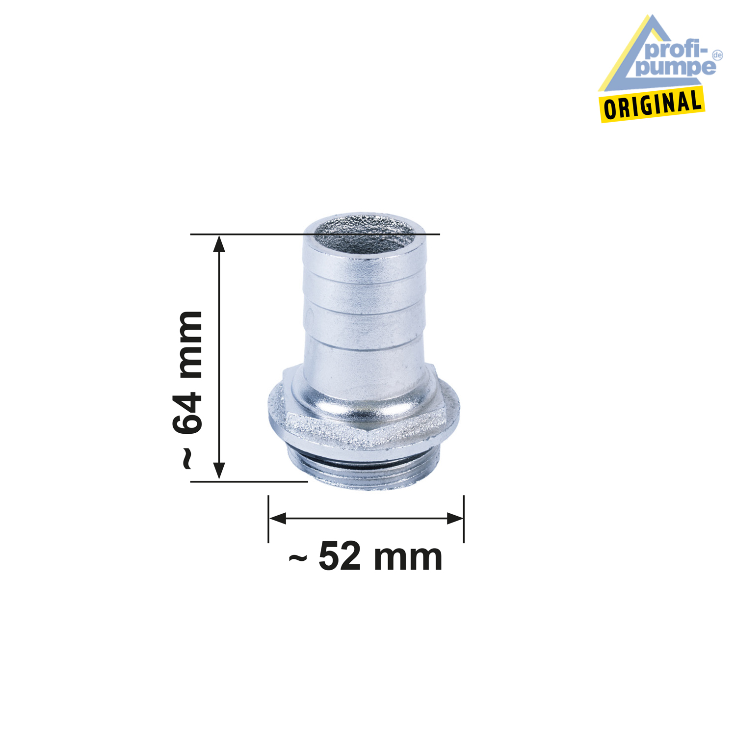 Der Grauguss Adapter mit einem Außengewinde von AG 1 ¼“ (1,25 Zoll) ist mit einem Anschluss für Schläuche mit einem Innendurchmesser von 32 mm geeignet. Das Verbindungsstück misst eine Gesamtlänge von 64 mm und einen Gesamtdurchmesser von 52 mm .