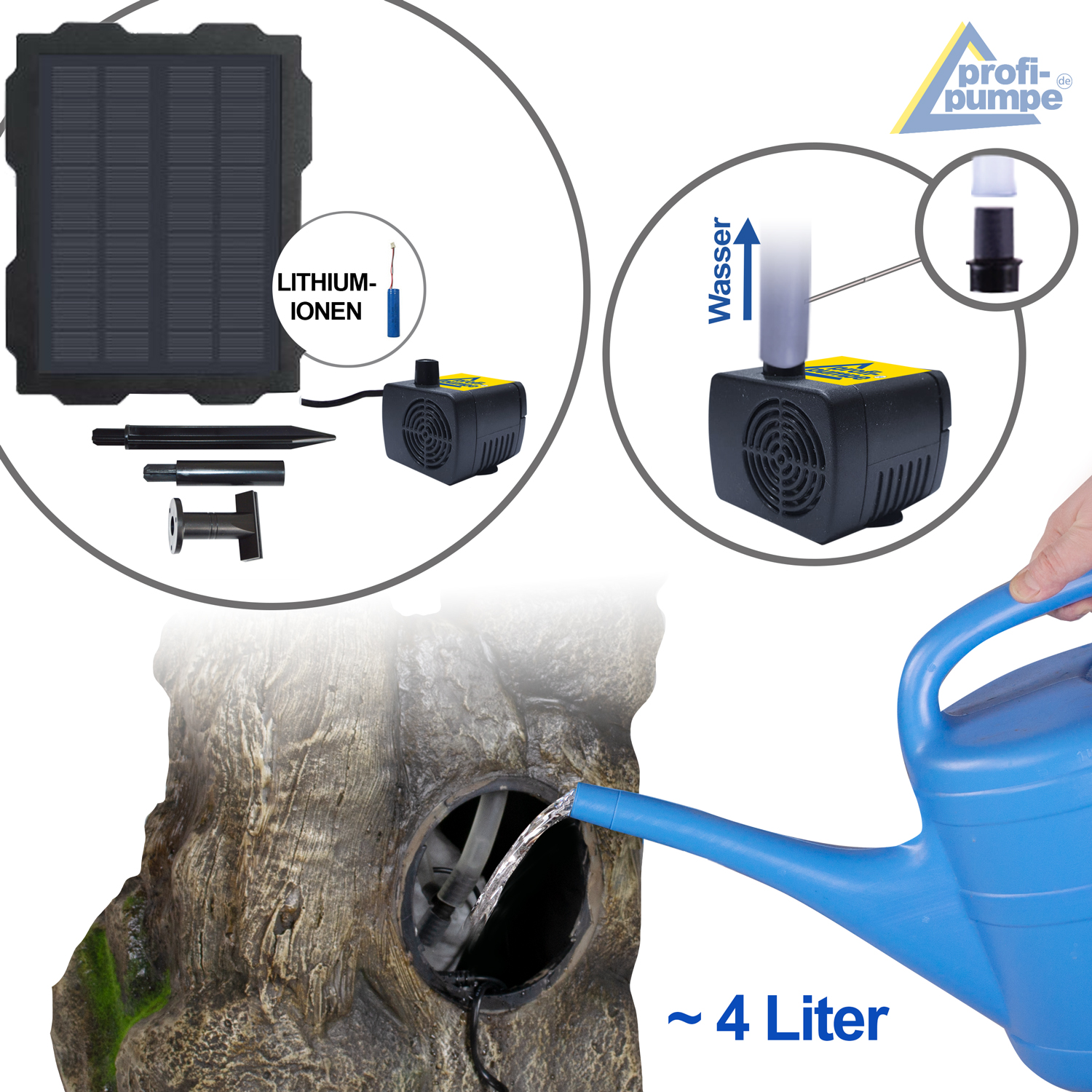 Dieser Gartenbrunnen kann bei Tageslicht aber auch nach dem Sonnenuntergang oder bei ungünstigen Lichtverhältnissen genossen werden. Durch den eingebauten Li-Ion Akku wird das Sonnenlicht gespeichert und für Tage mit schwachen Sonnenlicht benutzt. Die maximale Förderleistung wird bei optimalen Bedingungen erreicht, wie z.B. ein sonniger Tag und ein aufgeladener Akku. Wenn die Batterie schwach ist und es ist ein bewölkter Tag, schaltet die Pumpe in den Intervall-Modus. Sobald am nächsten Tag die Sonne scheint, schaltet die Pumpe automatisch wieder zurück in den Normalmodus. Die Akku-Funktion kann auch ausgeschaltet werden.