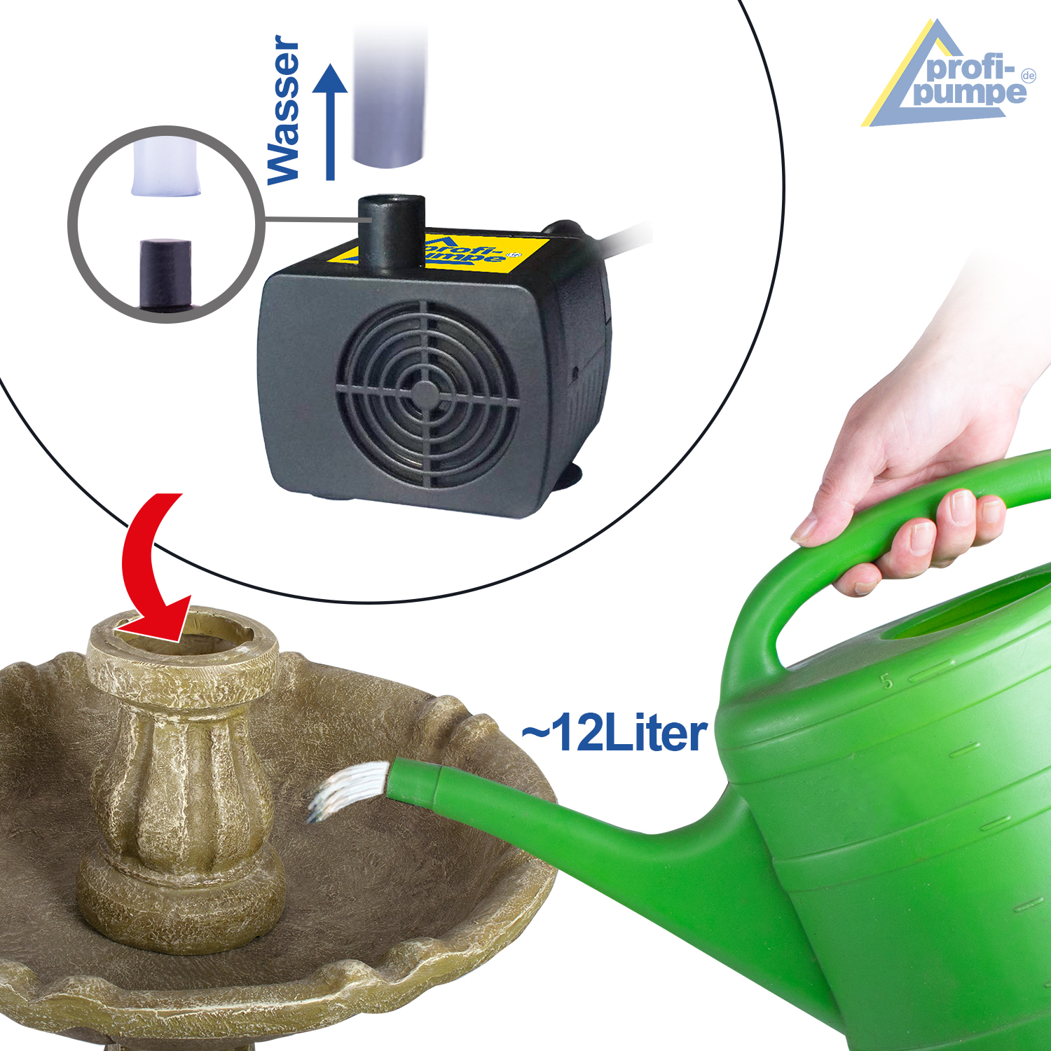 Poznámka: Frost kann zu Schäden am Gartenbrunnen und der Pumpe führen. Bei Frostgefahr muss der Gartenbrunnen und die Pumpe entleert werden, mit klarem Wasser gespült und trocken eingelagert werden. Dann haben Sie sehr lange Freude daran!