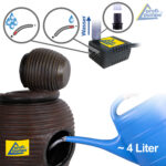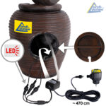 Der wirkungsvolle Zierbrunnen “4-AMPHOREN” ist für den 230-Volt-Betrieb vorgesehen. Die Pumpe und die LEDs werden mit sicherer 12V-Niederspannung betrieben (Adapter im Lieferumfang enthalten). Alle Kabelverbindungen sind verpolungssicher, wasserdicht und absolut funktionssicher. Dank praktischer Steckverbindungen sind alle Komponenten jederzeit austauschbar. So können Sie den Wasserbrunnen “4-AMPHOREN” und das fließende Wasser jahrelang genießen!