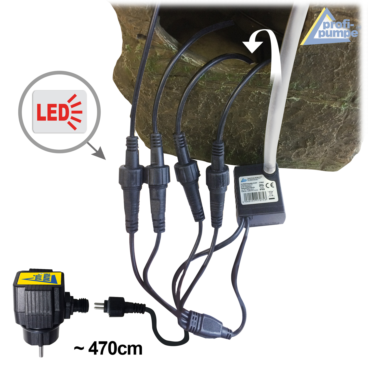 - Mit 230V/12V-Anschluss, 3,6 Watt Pumpe und LED-Ring in warmem Weiß