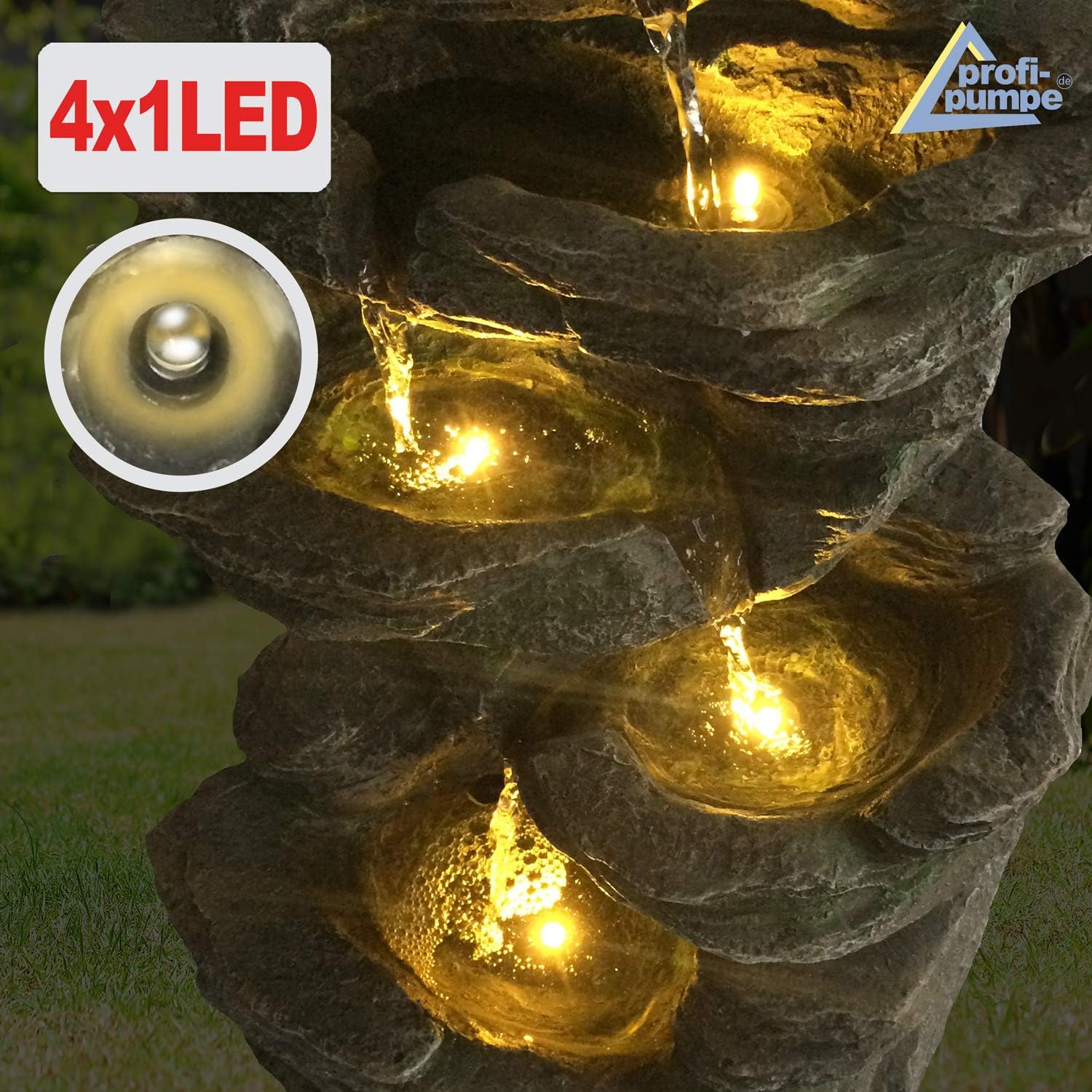 Gartenbrunnen KÖNIGS-FELS mit LED-Ring (4×1 warm weiß) und 230/12V-Netzadapter. Für den Innen- und Außenbereich.