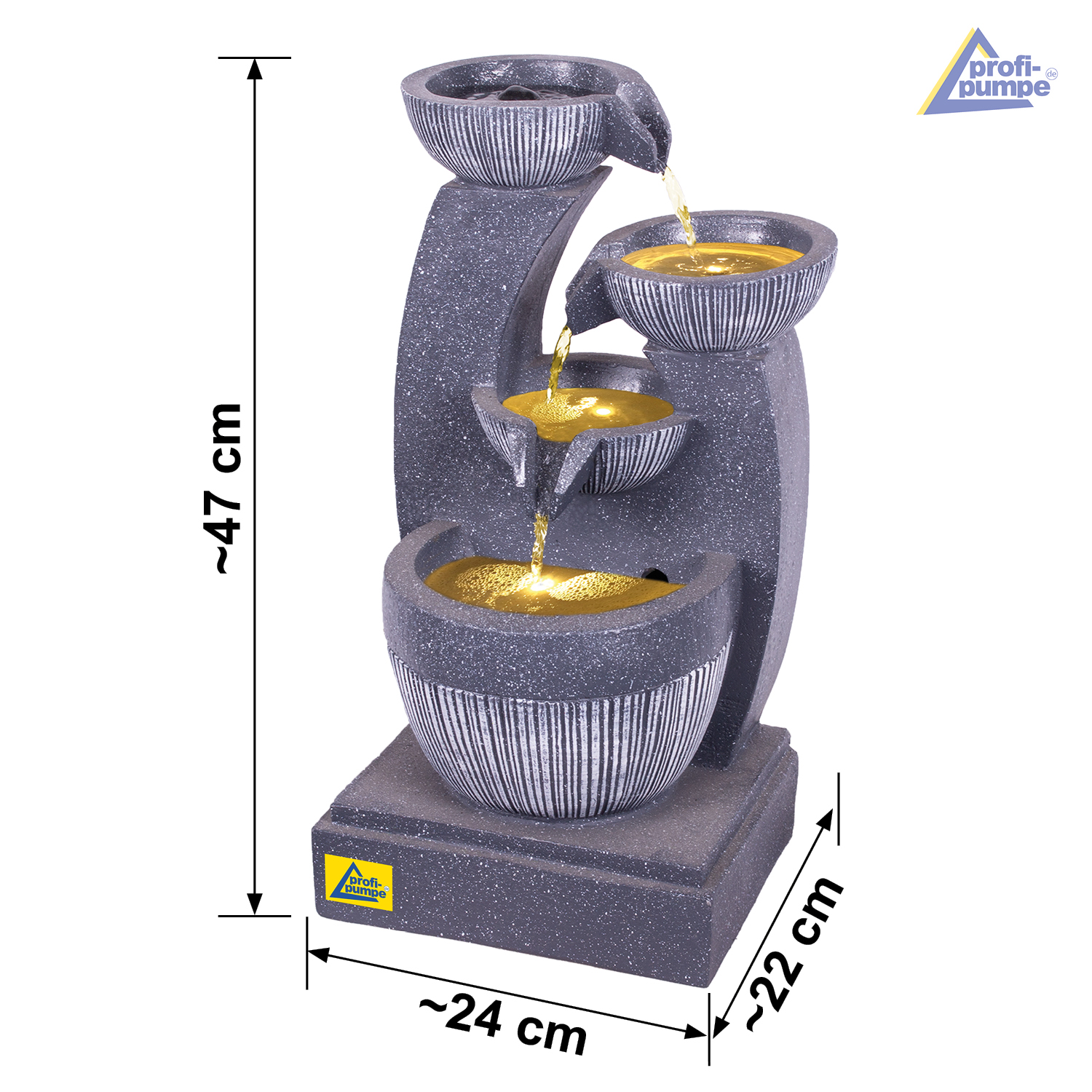 The “SCHALEN-SPIEL” mit 3 austauschbaren LED-Lichtern (3*1) ist für den Innen- und Außenbereich geeignet. Betrieben wird der stilvolle Wasserbrunnen mit einem 230/12-Volt Netzadapter. Mit der wirklichkeitsgetreuen Stein-Dekoration sorgt der moderne Gartenbrunnen für eine harmonische Atmosphäre und Entspannung. Das Lebenselixier Wasser belebt Wohnzimmer, Esszimmer, Flure und Eingangsbereiche, Wintergärten oder Balkone, Terrassen und Gärten im privaten wie gewerblichen Umfeld.