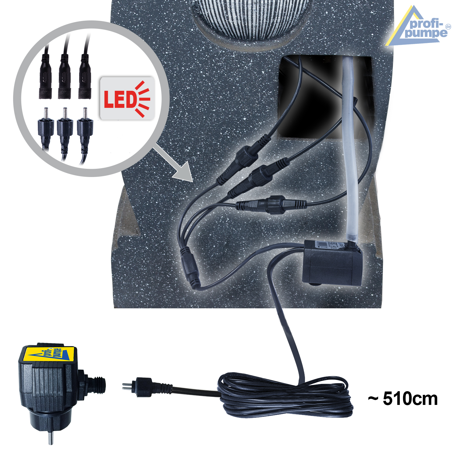 Der Wasserbrunnen ist für den 230-Volt-Betrieb vorgesehen. Die Pumpe und die LEDs werden mit sicherer 12V-Niederspannung betrieben (Adapter im Lieferumfang enthalten). Alle Kabelverbindungen sind verpolungssicher, wasserdicht und absolut funktionssicher. Dank praktischer Steckverbindungen sind alle Komponenten jederzeit austauschbar. So können Sie den Wasserbrunnen mit der effektvollen LED-Beleuchtung und das fließende Wasser jahrelang genießen!