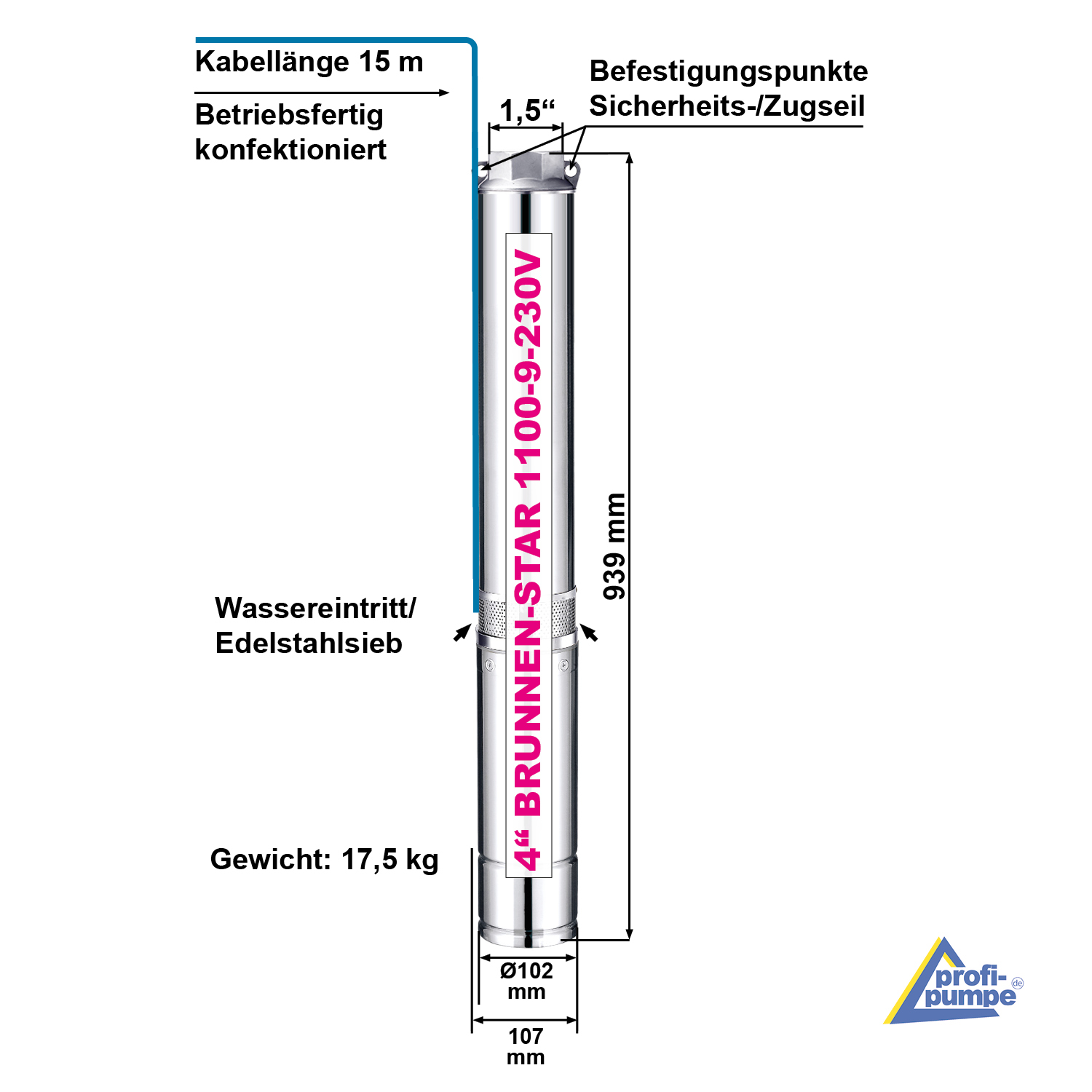 Mit einem Durchmesser von ca. 102mm ist die 939 mm lange Brunnenpumpe mit 15m Kabel für Schächte mit bis zu ca. 5-7m Tiefe geeignet. Durch die seitliche Ansaugung wird verhindert, dass Bodensediment mit angesaugt wird.