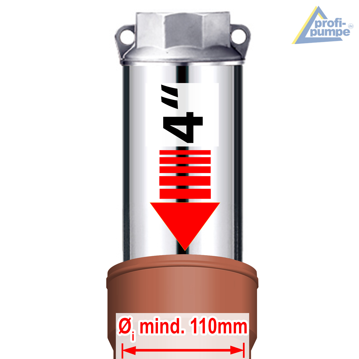 Mit einem Durchmesser von ca. 102mm ist die 680 mm lange Brunnenpumpe mit 15m Kabel für Schächte mit bis zu ca. 5-7m Tiefe geeignet. Durch die seitliche Ansaugung wird verhindert, dass Bodensediment mit angesaugt wird.