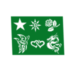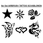 Mit dem “Airbrush Tattoo Schablonen 6er Set” erhalten Sie 6Stck. selbstklebende Schablonen (je Schablone ein Motiv) mit trendigen Tattoo-Motiv-Vorlagen (Stern, Sonne, Rose, Drache, Herzen, Schmetterling) für die Erstellung von professionellen Airbrush-Tattoos – lassen Sie Ihrer Kreativität freien Lauf!