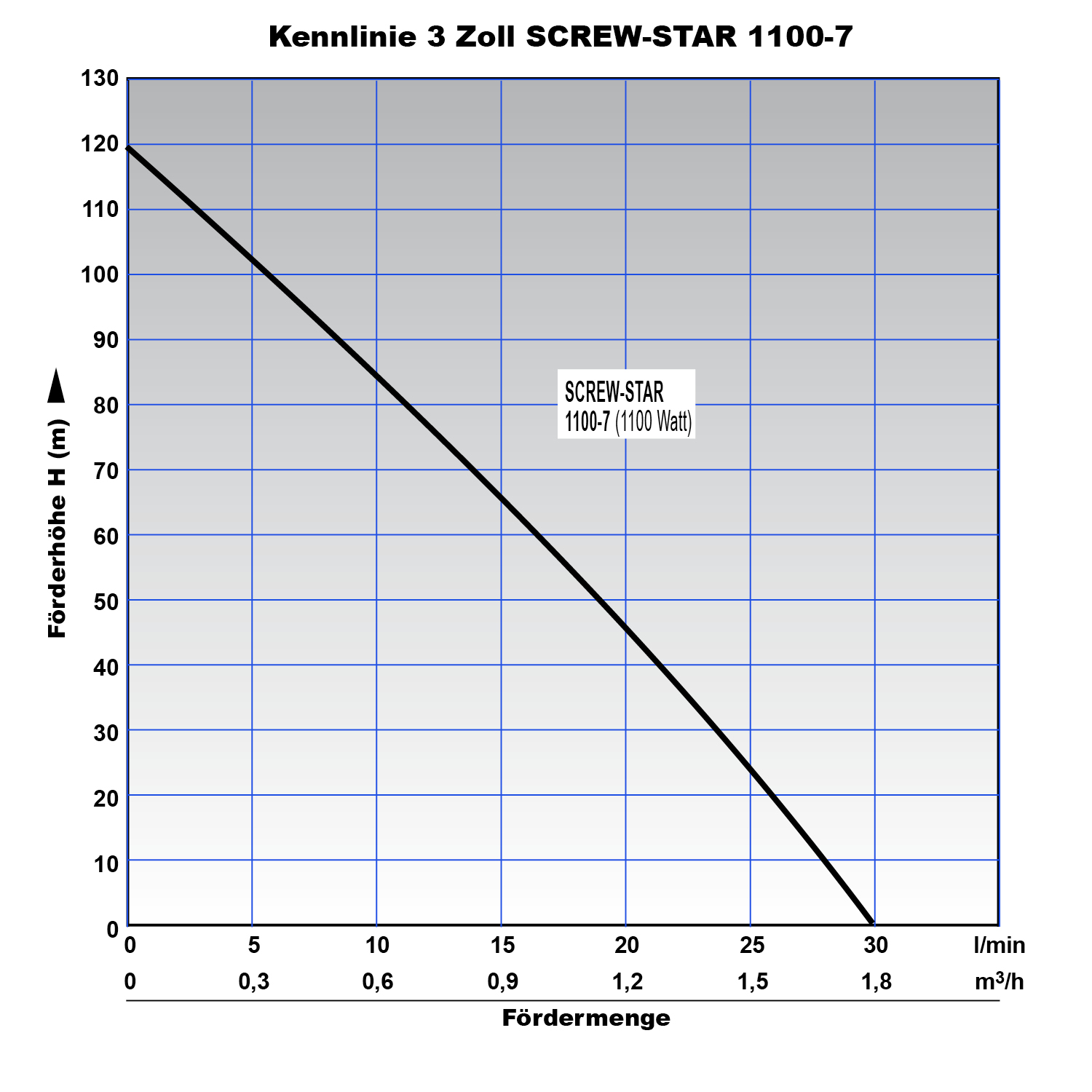 Die maximale Fördermenge dieser sandverträglichen Brunnenpumpe beträgt 1.800l/h, die maximale Förderhöhe 120m und der maximale Förderdruck liegt bei 12 bar. Bitte beachten Sie, dass die Förderleistung bei steigender Förderhöhe entsprechend abnimmt.
