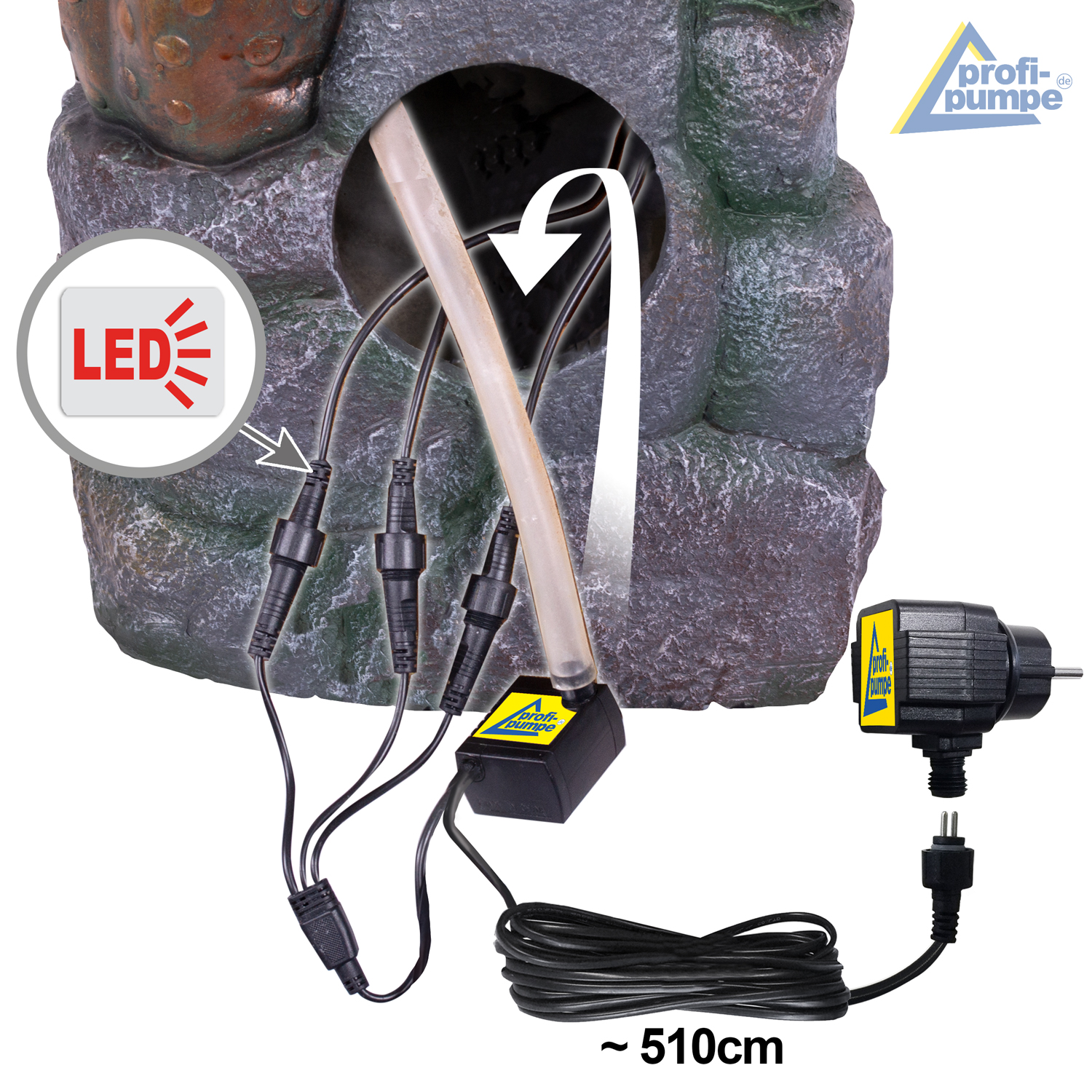 Der Wasserbrunnen ist für den 230-Volt-Betrieb vorgesehen. Die Pumpe und die LEDs werden mit sicherer 12V-Niederspannung betrieben (Adapter im Lieferumfang enthalten). Alle Kabelverbindungen sind verpolungssicher, wasserdicht und absolut funktionssicher. Dank praktischer Steckverbindungen sind alle Komponenten jederzeit austauschbar. So können Sie den Wasserbrunnen mit der effektvollen LED-Beleuchtung und das fließende Wasser jahrelang genießen!