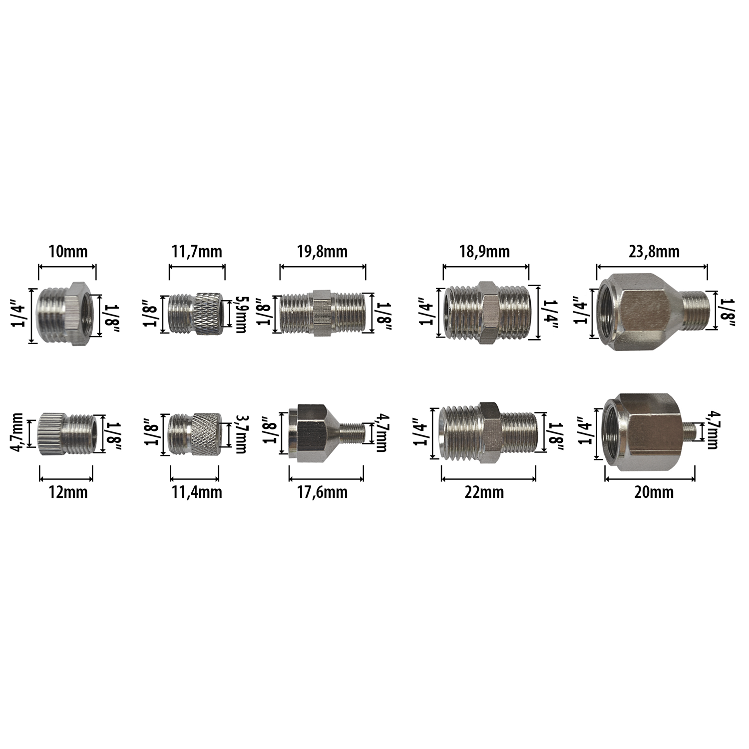Mit diesem 10er Airbrush Adapter-Set sind Sie für jegliche Anschlussarten von Airbrush Kompressoren und Airbrush Pistolen gerüstet – kaum etwas, das Sie mit diesem Universal-Verbindungsstück-Set nicht angeschlossen bekommen! Ein Muss für jedermann, der mit Airbrush arbeitet!