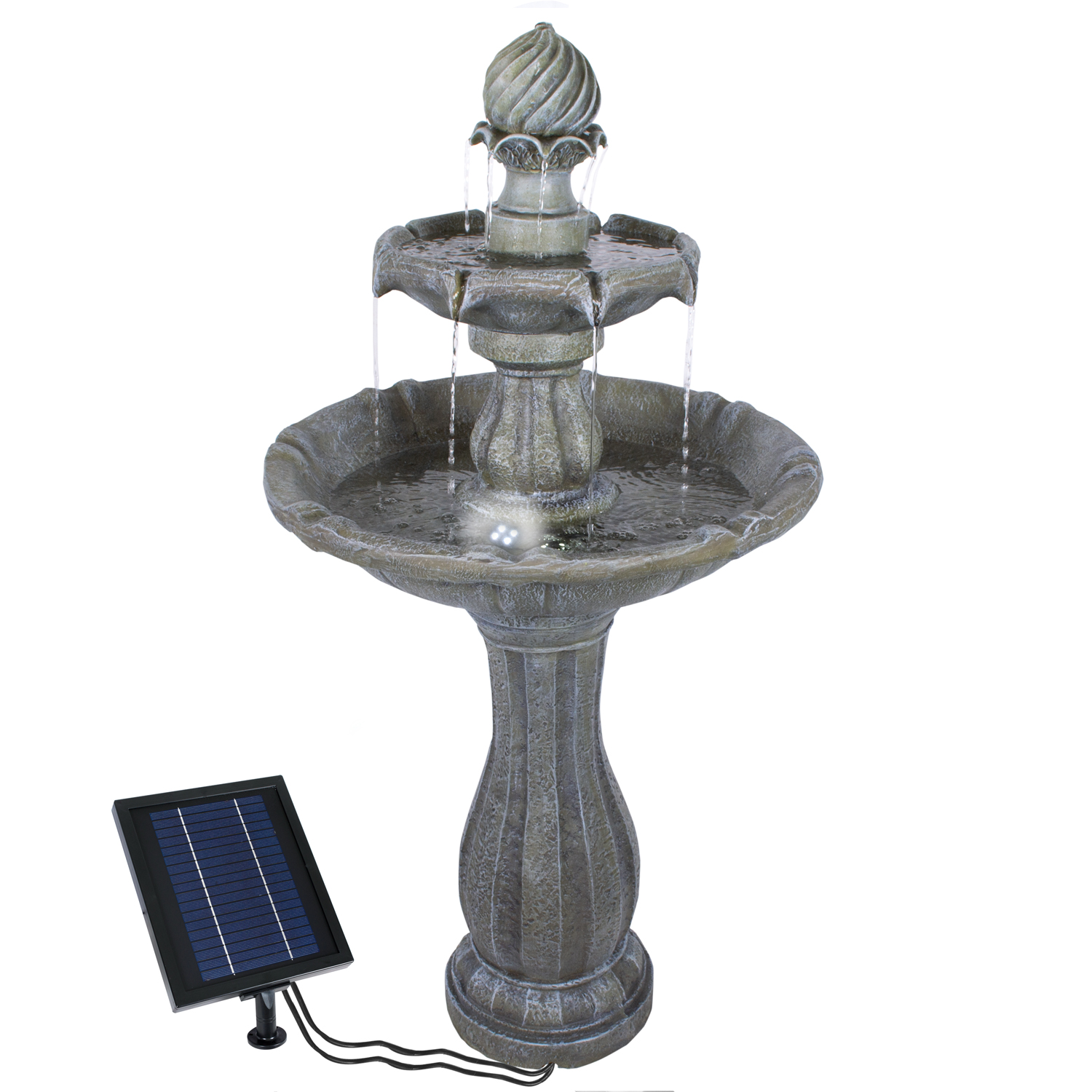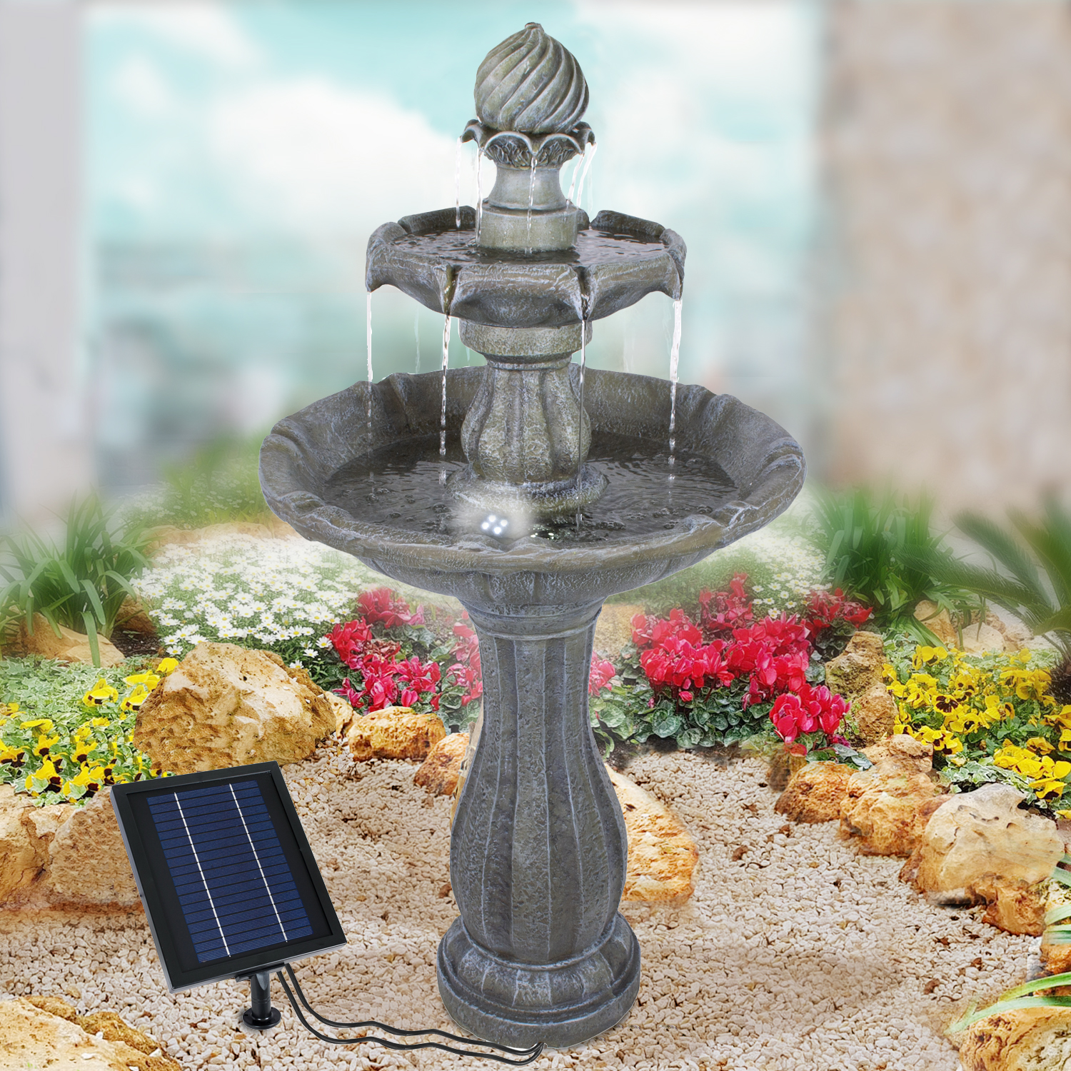 Solarbetriebener Garten-Brunnen mit Li-Ion Akku und LED-Lichter