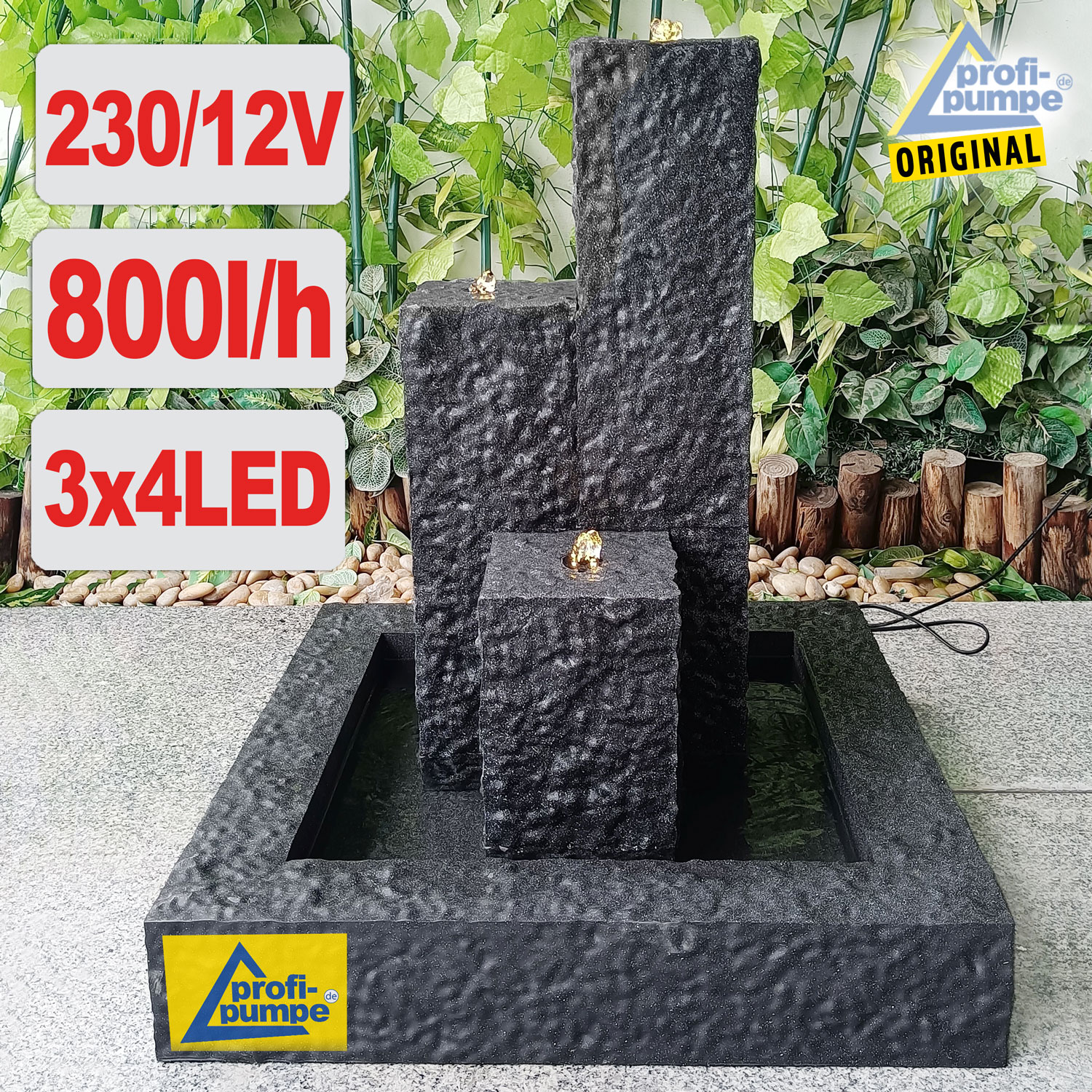 230V – Gartenbrunnen & Wasserspiel “TRIO-BASALT-2 dunkel” mit LED-Licht