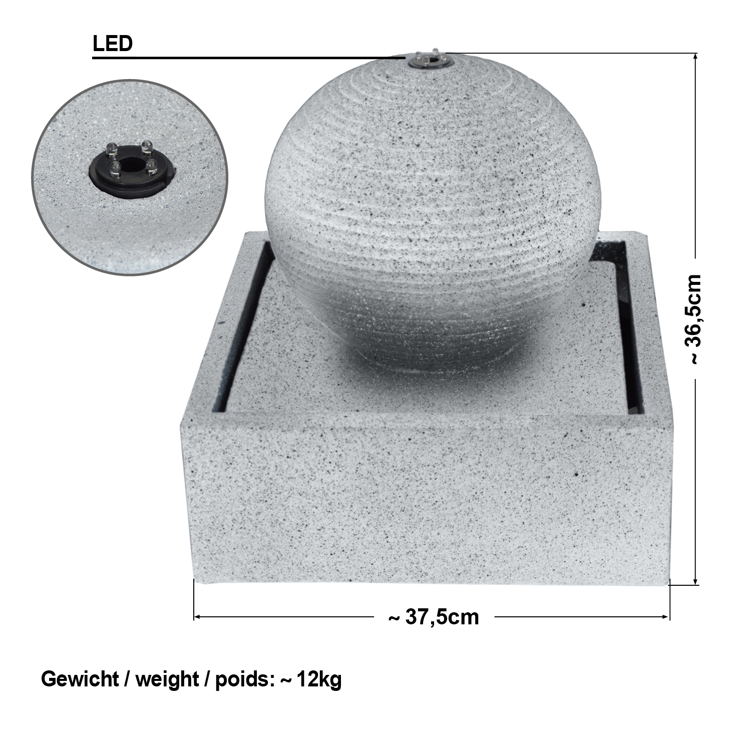 Der Gartenbrunnen ist sowohl bei Tag als auch bei Nacht der perfekte Hingucker. Die mitgelieferte LED-Beleuchtung sorgt für die perfekte Illumination. Die LED-Lichter des austauschbaren LED-Rings erstrahlen in klassischem Weiß.