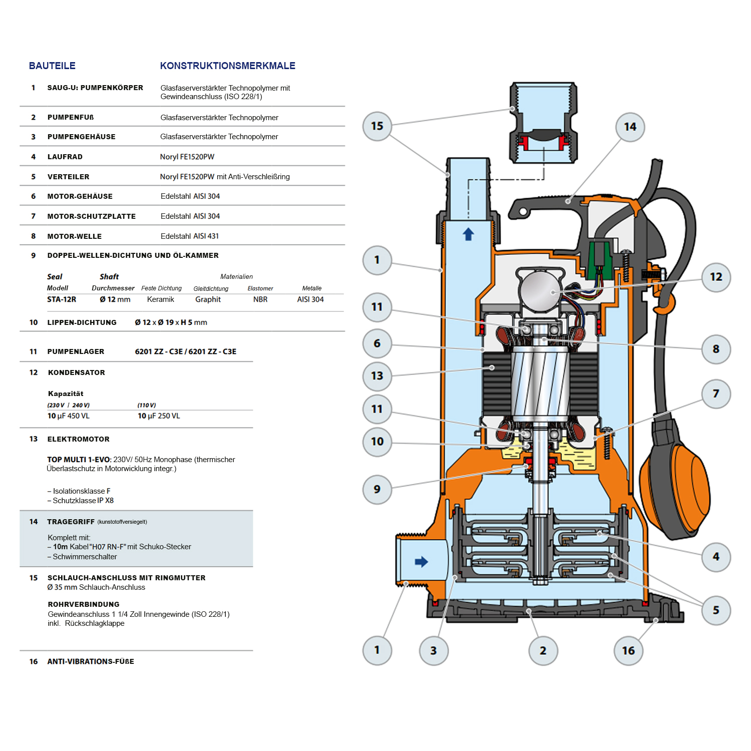 Die Tauchdruckpumpe für schwimmende Entnahme – TOP MULTI 2 – EVO stammt aus hochwertiger europäischer Fertigung. Die Tauchpumpe mit Schwimmerschalter besteht aus soliden Bauelementen von bewährter Qualität: Edelstahl-Motorwelle, Edelstahl-Motorgehäuse und Edelstahl-Motorschutzplatte sind eingebettet in einem aus glasverstärktem Technopolymer bestehenden Pumpen-Körper. Die Doppel-Wellen-Dichtung besteht aus Keramik (feste Dichtung) und Graphit (Gleitdichtung). In der Laufrad-Konstruktion ist ein lebensverlängernder und qualitätssichernder Anti-Verschleißring integriert.