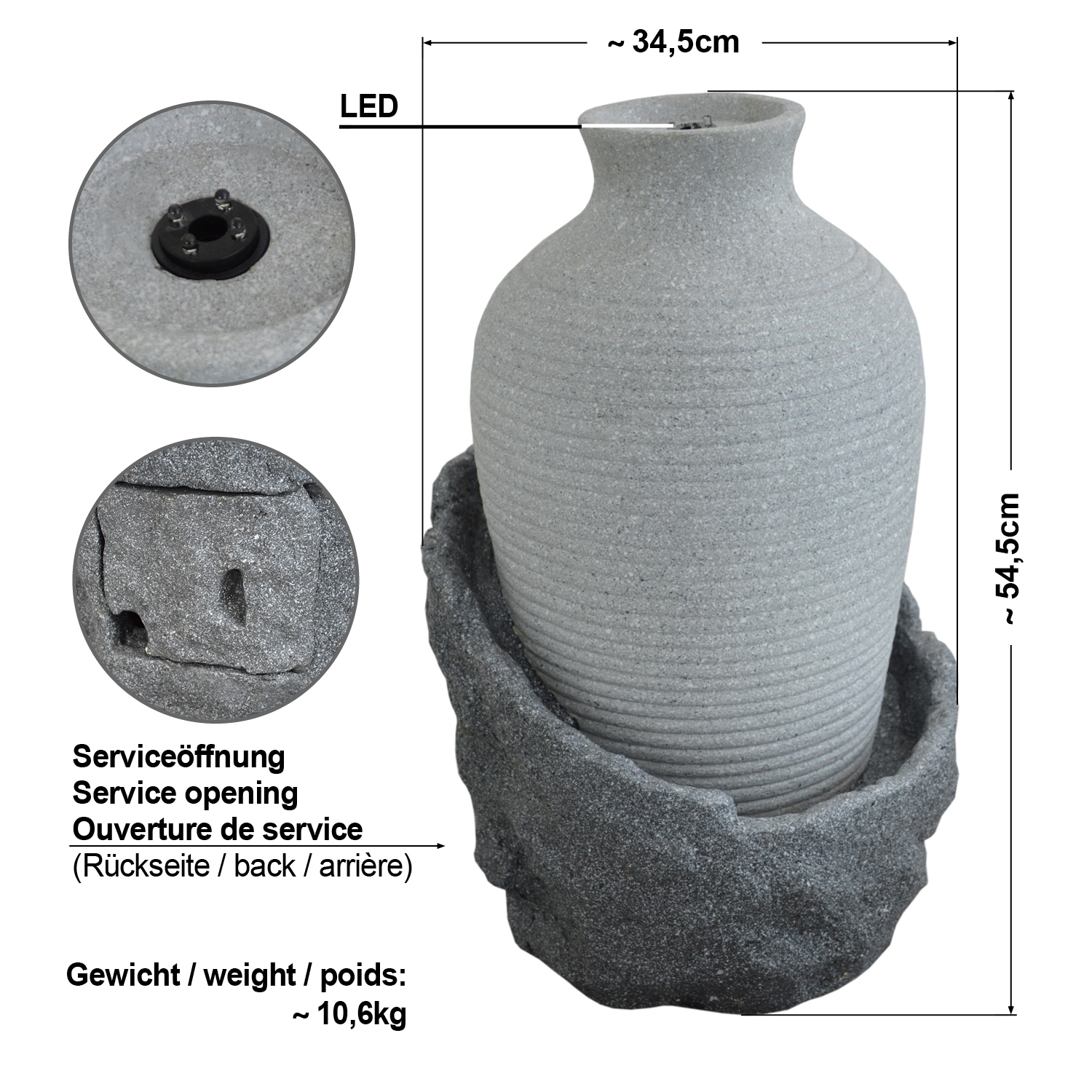 Der Wasserbrunnen AMPHORE KORFU ist sowohl bei Tag als auch bei Nacht der perfekte Blickfang. Die mitgelieferte LED-Beleuchtung sorgt für die perfekte Illumination. Die LED-Lichter des austauschbaren LED-Rings erstrahlen in einem klassischen Weiß.