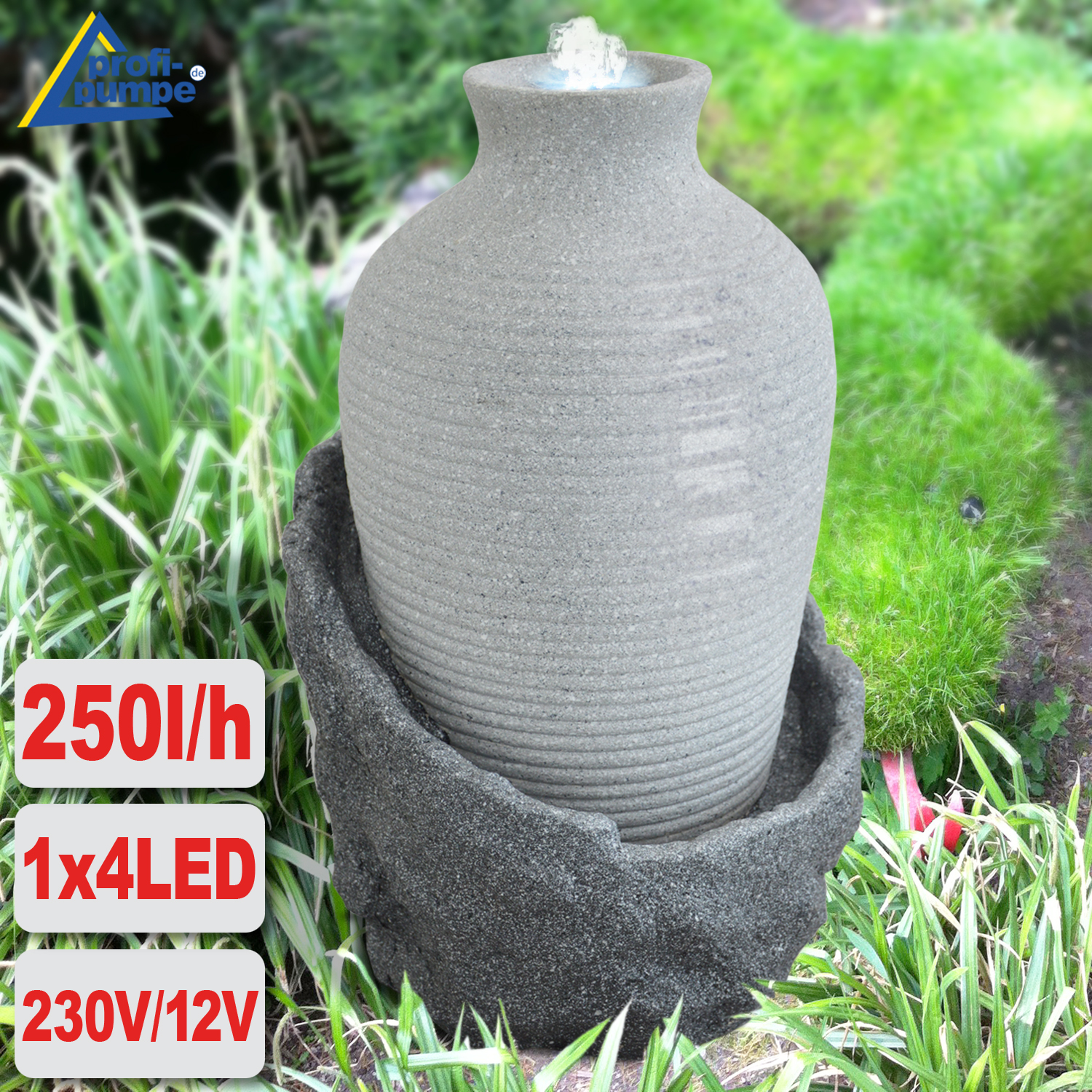 Der wirkungsvolle Zierbrunnen AMPHORE KORFU ist für den 230-Volt-Betrieb vorgesehen. Die Pumpe und die LEDs werden mit sicherer 12V-Niederspannung betrieben (Adapter im Lieferumfang enthalten). Alle Kabelverbindungen sind verpolungssicher, wasserdicht und absolut funktionssicher. Dank praktischer Steckverbindungen sind alle Komponenten jederzeit austauschbar. So können Sie den Garten- und Zimmerbrunnen AMPHORE KORFU und das fließende Wasser jahrelang genießen!