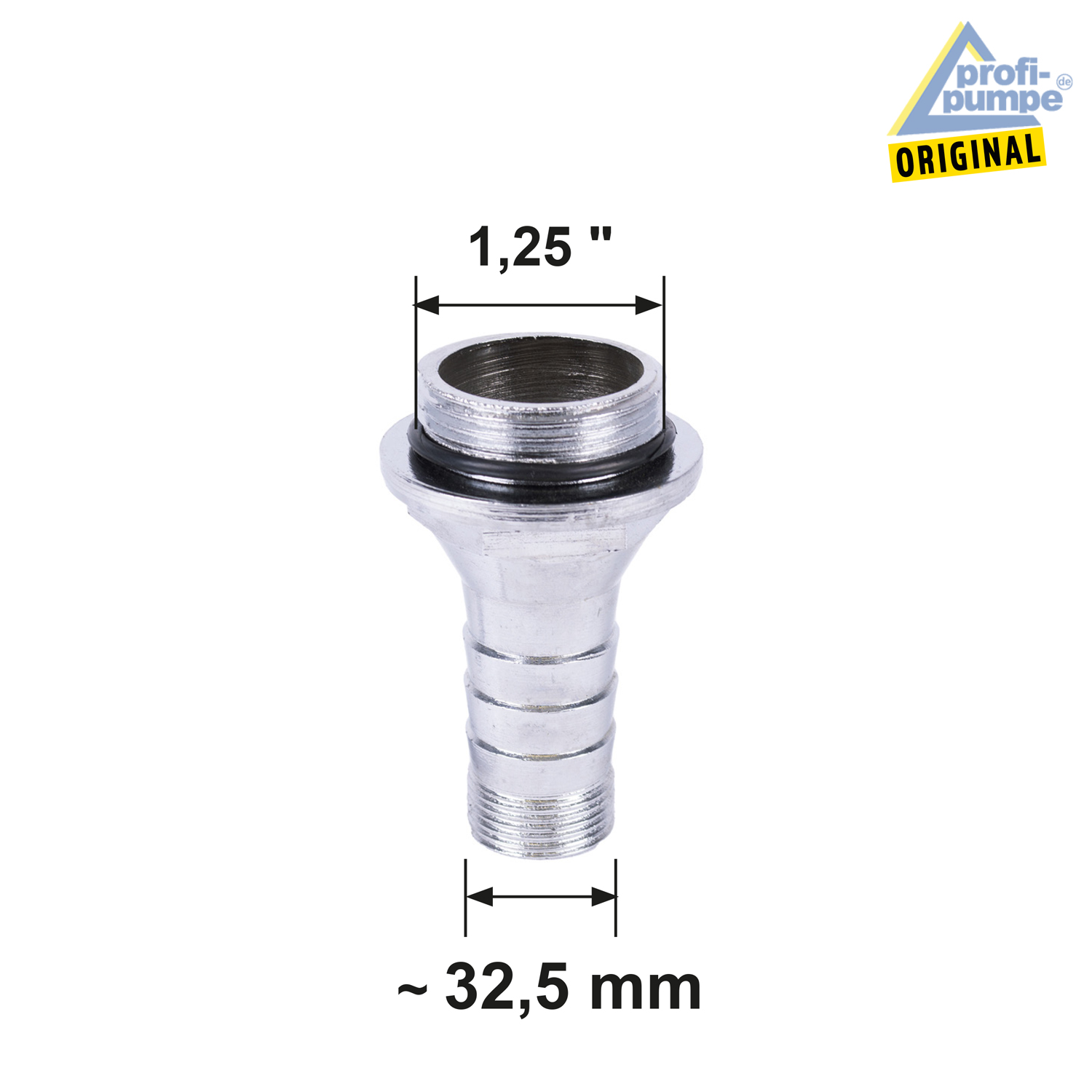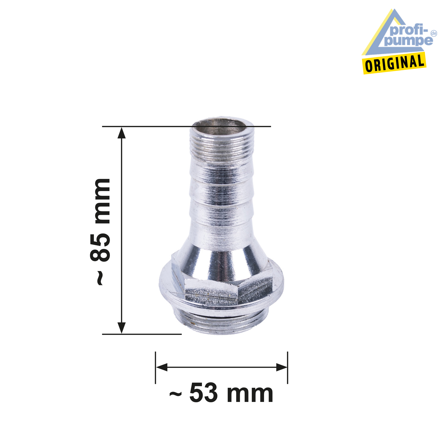 Der Grauguss Adapter mit einem Außengewinde von AG 1 ¼“ (1,25 Zoll) ist mit einem Anschluss für Schläuche mit einem Innendurchmesser von 25 mm geeignet. Das Verbindungsstück misst eine Gesamtlänge von 85 mm und einen Gesamtdurchmesser von 53 mm .