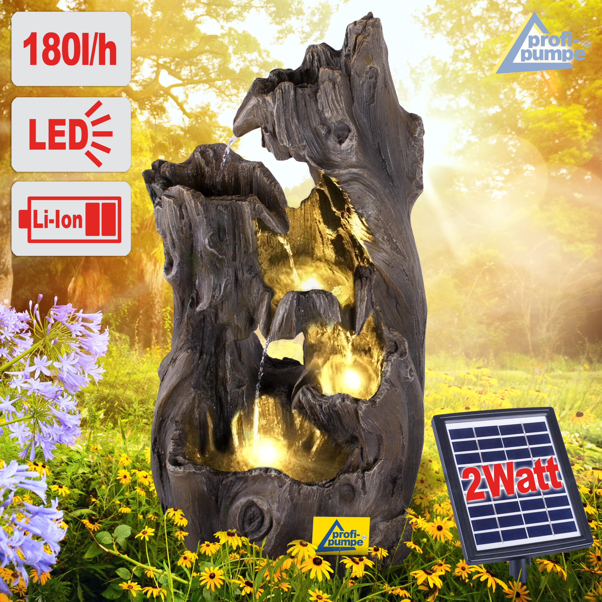 Solarbetriebener Garten-Brunnen mit Li-Ion Akku und LED-Lichter