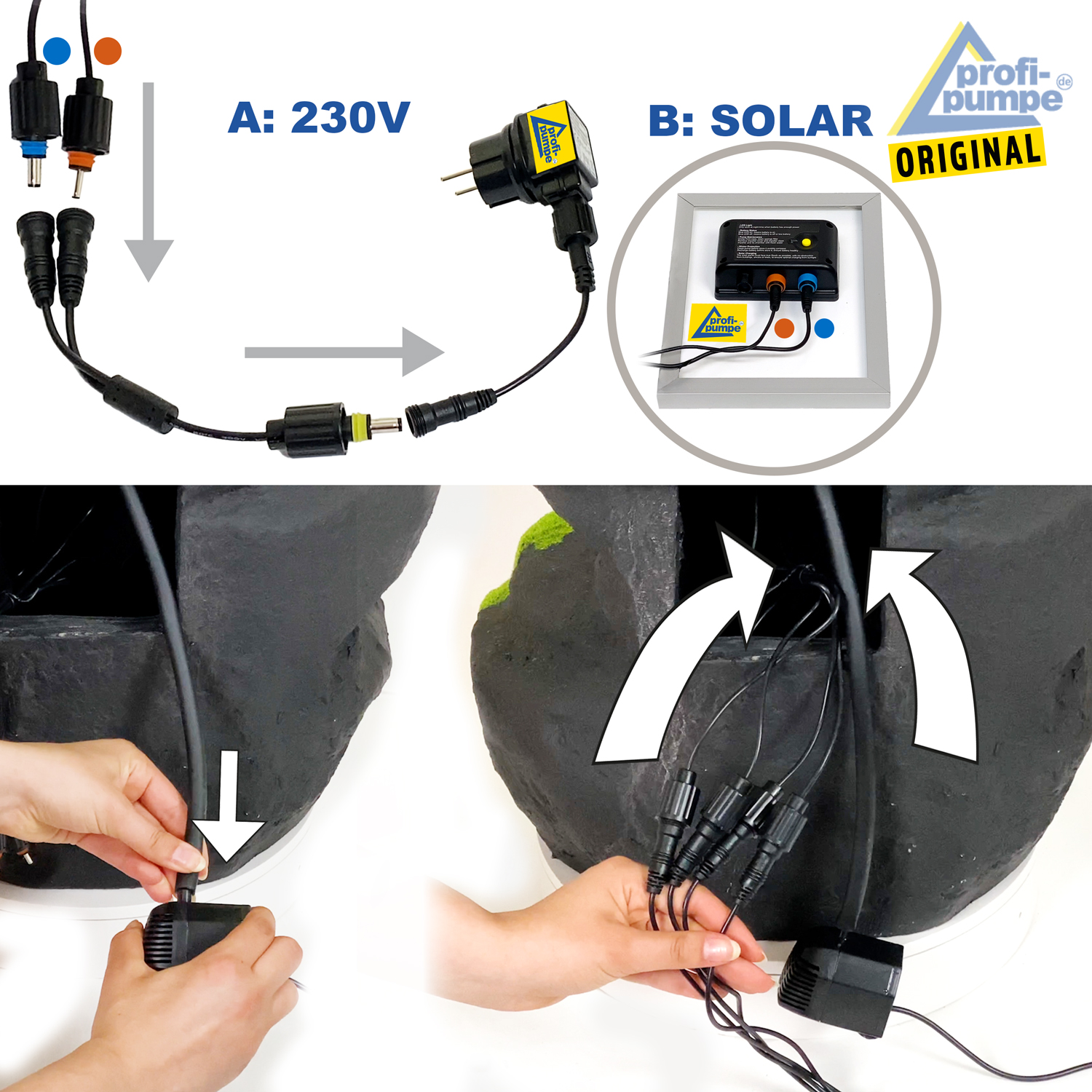 Der rustikale Zierbrunnen “FELS-KASKADE geschwungen” als Basisversion ist fรผr den 230-Volt-Betrieb vorgesehen. Die Pumpe und die LEDs werden mit sicherer 12V-Niederspannung betrieben (Adapter im Lieferumfang enthalten). Alle Kabelverbindungen sind verpolungssicher und wasserdicht. Der Aufbau geht einfach und schnell.