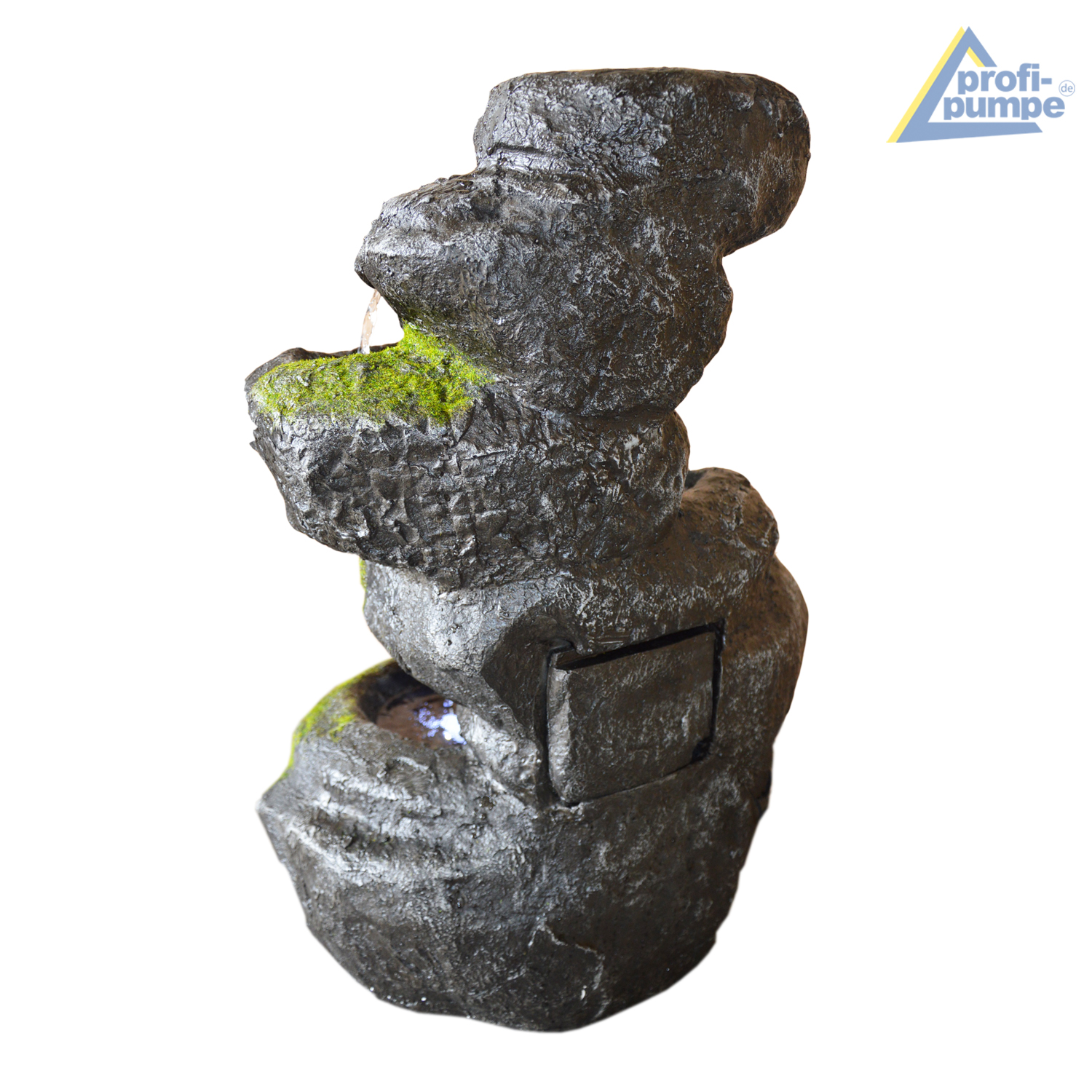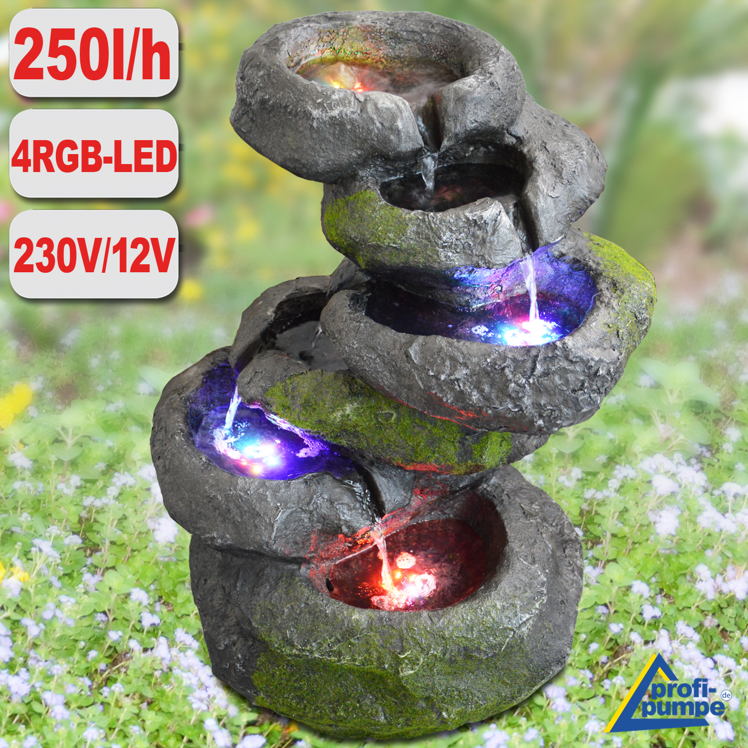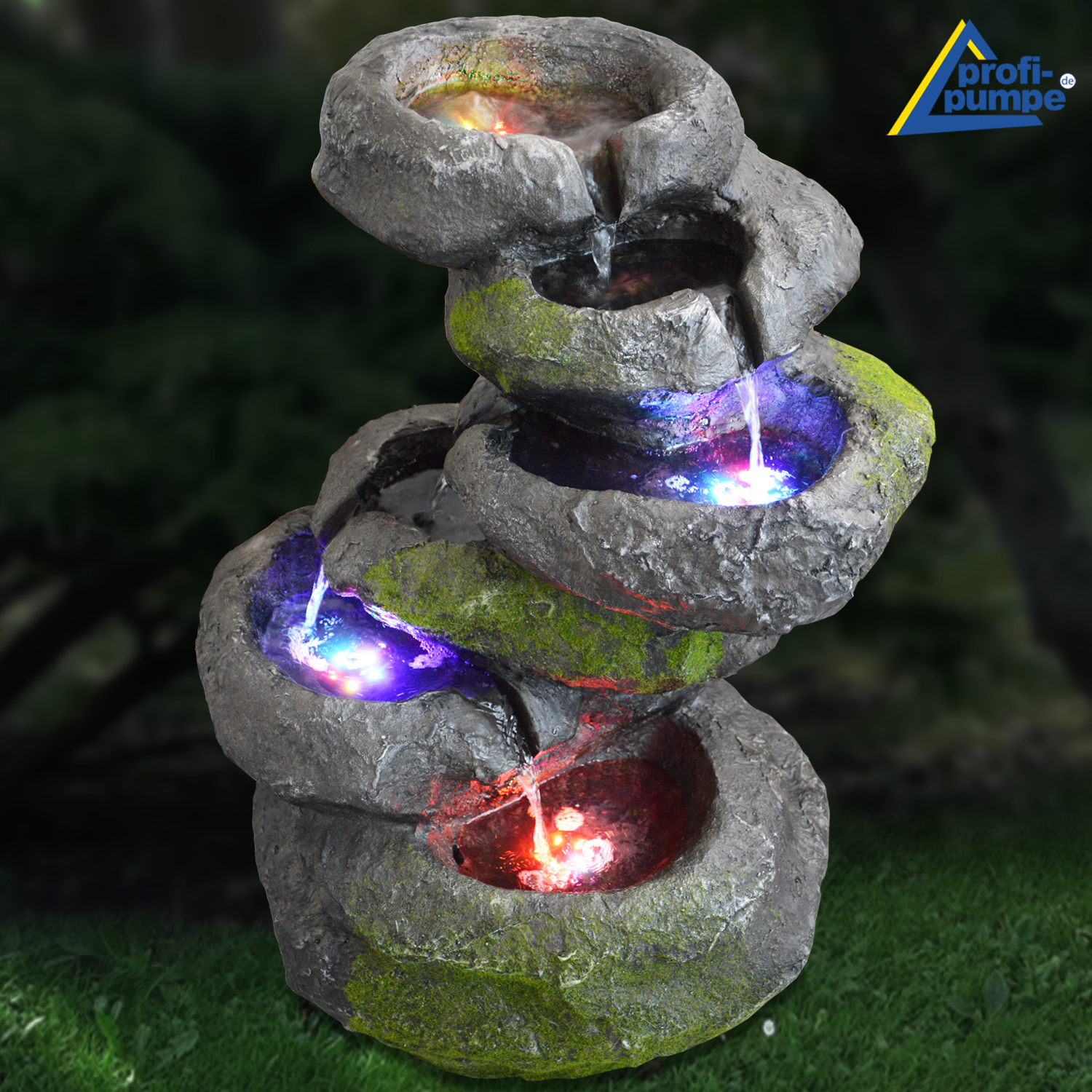 Gartenbrunnen FELS-KASKADE geschwungen mit 4 RGB LED-Licht-230V