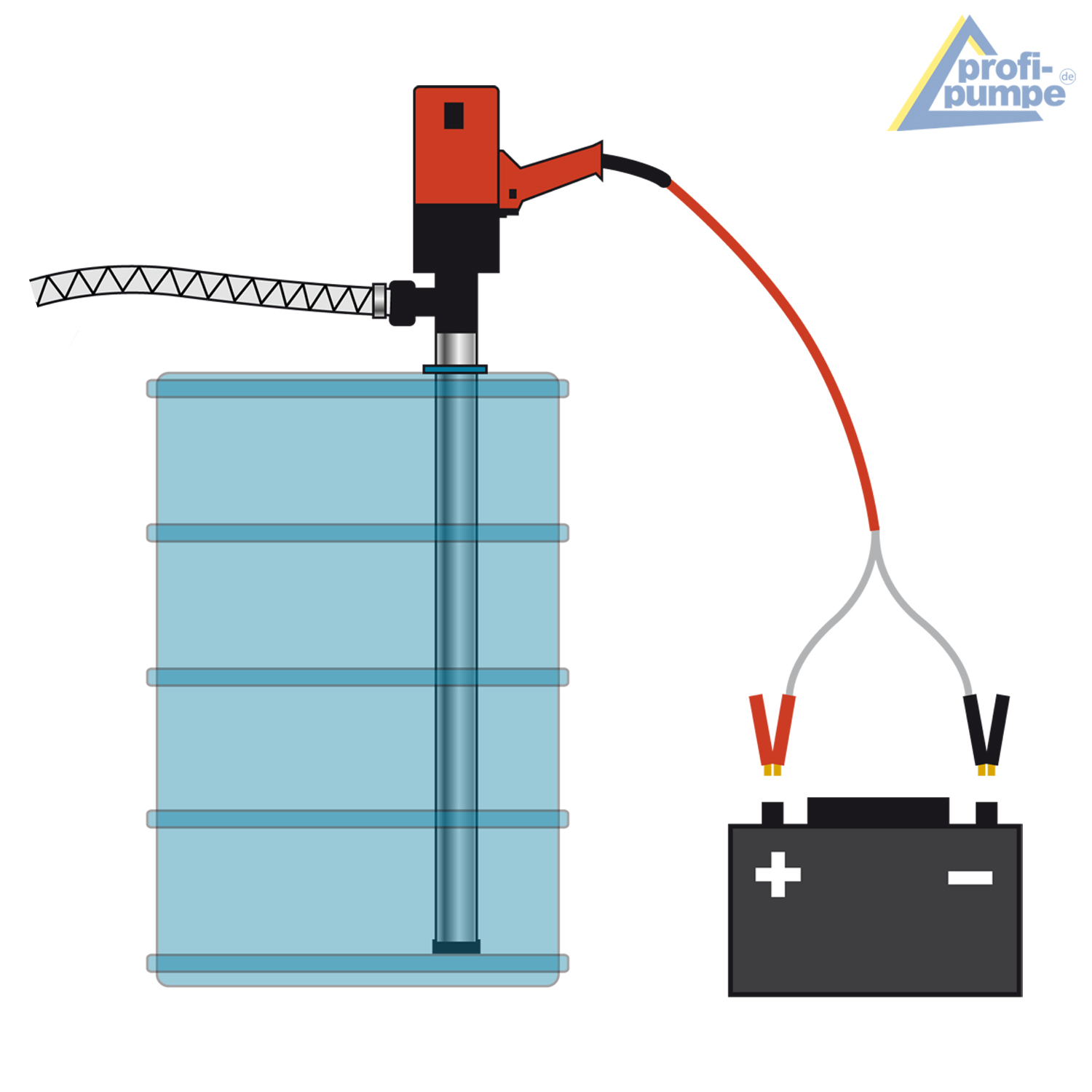 Bitte unbedingt auf Batteriespannung achten, sonst kann die Pumpe beschรคdigt werden! Die Fasspumpen sind fรผr das Pumpen von Benzin, Kerosin oder anderen brennbaren Flรผssigkeiten nicht geeignet.