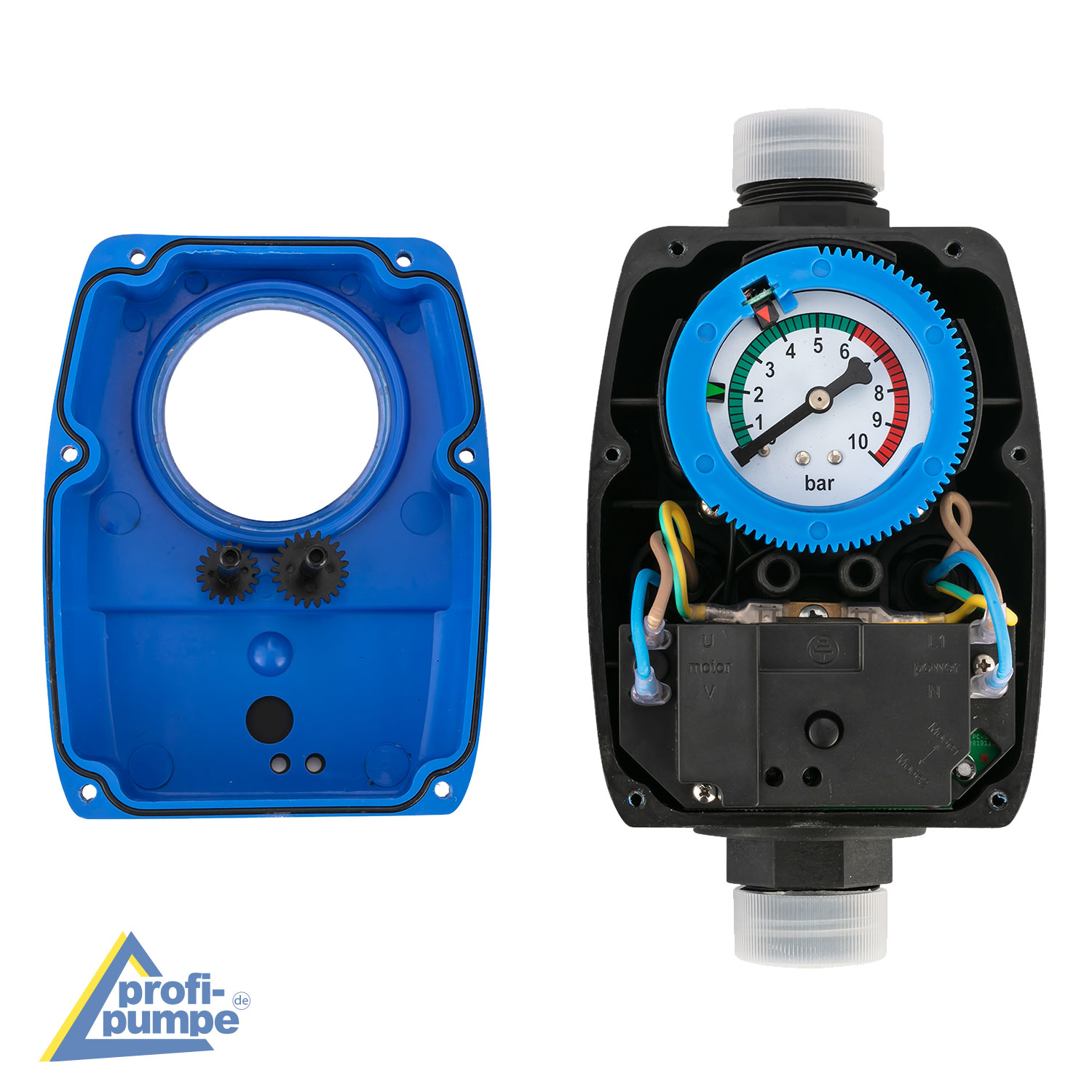 Die Besonderheiten an diesem Pumpen-Druckschalter sind der integrierte Manometer und der integrierte Trockenlaufschutz.