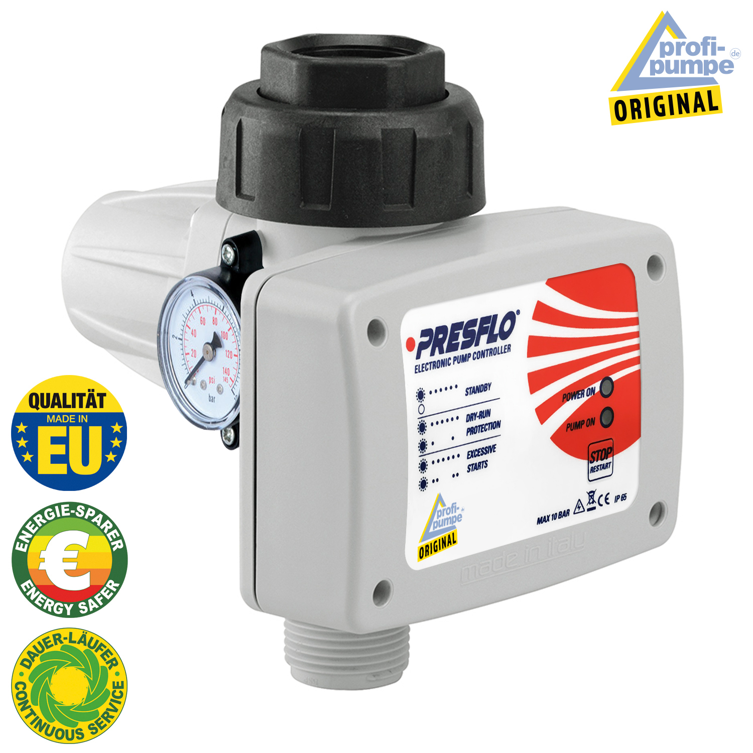 Der Durchflusswächter PRESFLO-2® – 1,5bar Einschaltdruck automatisiert und steuert das Einschalten der Kreisel- bzw. Tauchpumpe. Er überwacht den Druck im Rohrsystem von der Pumpe bis zum Verbraucher. Bei einer Wasserentnahme aus dem Rohrsystem nimmt der Druck ab. Fällt der Druck unter den eingestellten Betriebsdruck, schaltet der Durchflusswächter das angeschlossene Gerät (z.B. Kreiselpumpe) an. Diese versorgt die Verbraucher wieder mit Wasser. Wird der Verbraucher geschlossen, verringert sich der Durchfluss und die Pumpe wird abgeschaltet. Sollte nach Einschalten der Pumpe kein Wasser vorhanden sein, schaltet der Durchflusswächter wieder die Pumpe automatisch aus (Trockenlaufschutz).