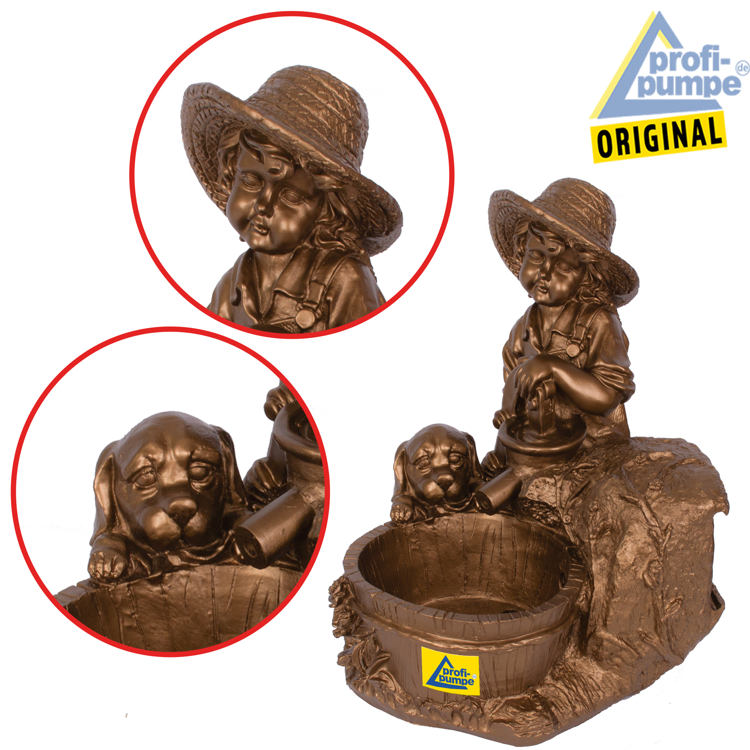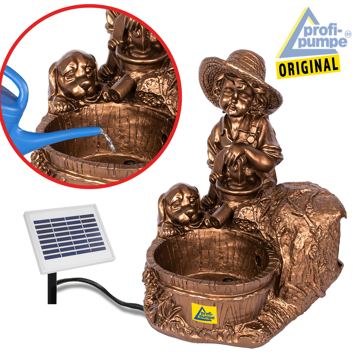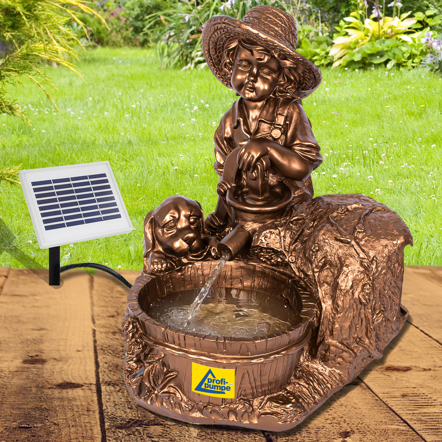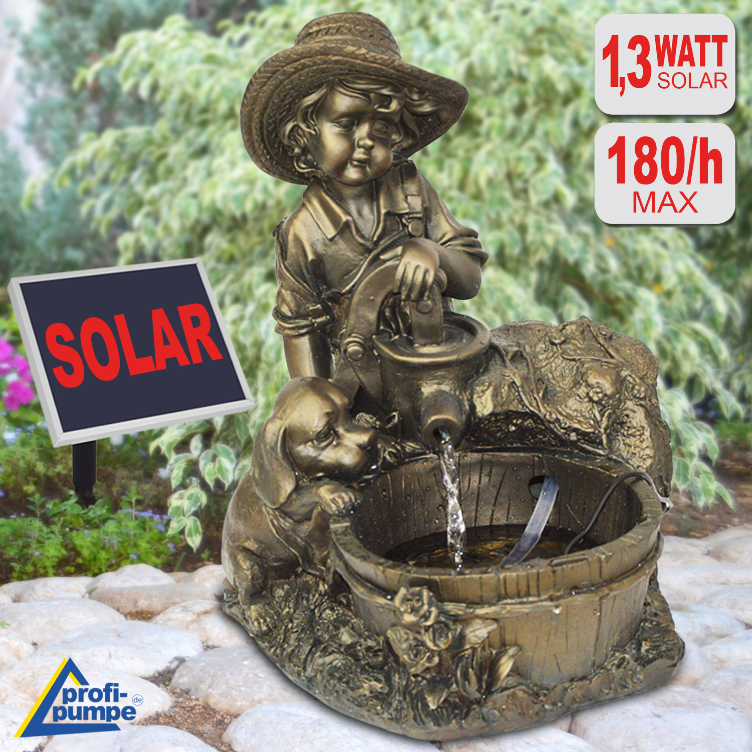 Solar Teichpumpen-Set “KNABE mit HUND am BRUNNEN” – Das Lebensgefรผhl fรผr Ihre Sonnen-Oase!