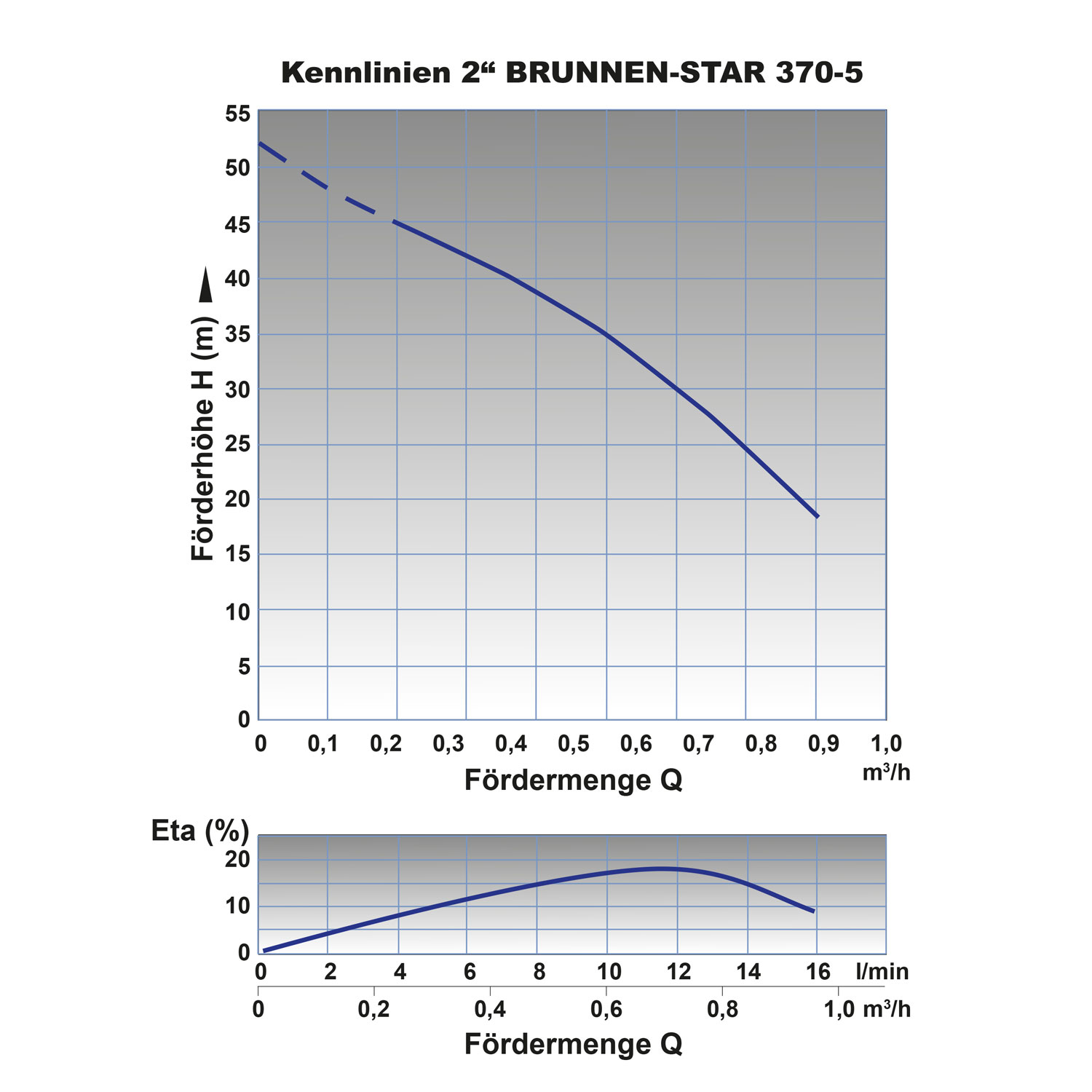 Die maximale Fördermenge dieser schmalen Tiefbrunnenpumpe beträgt 16 l/min (0,96cbm/h), die maximale Förderhöhe 51m und der maximale Förderdruck 5,1 bar. Bitte beachten Sie, dass die Förderleistung bei steigender Förderhöhe entsprechend abnimmt.