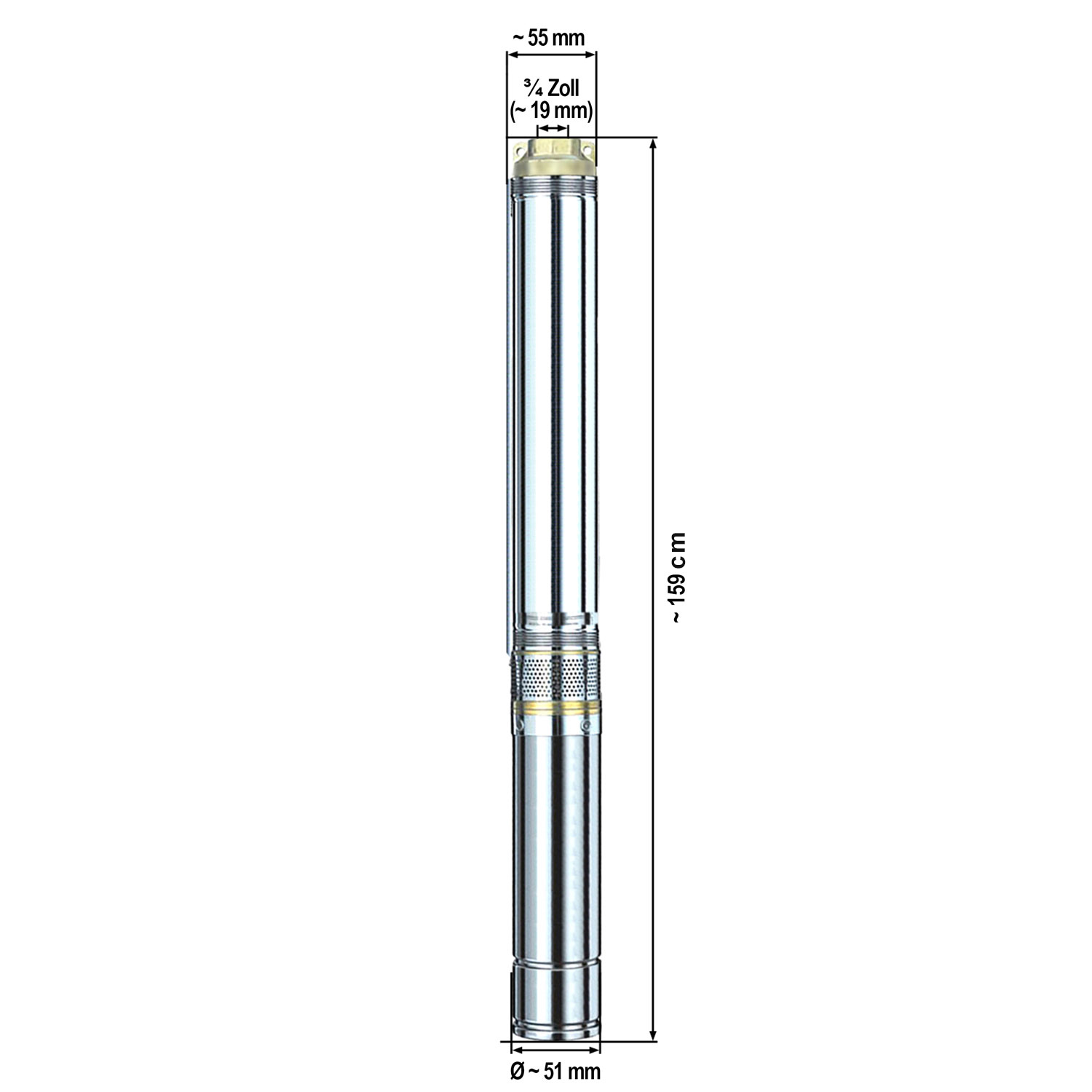 Mit 2 Zoll wird die Brunnenpumpe zur Problemlöserin: Die schlanke Tiefbrunnenpumpe hat einen Durchmesser von nur ca. 51mm. Die Brunnenpumpe kann optimal in engen Schächten mit einem Mindest-Durchmesser von 60mm eingesetzt werden.