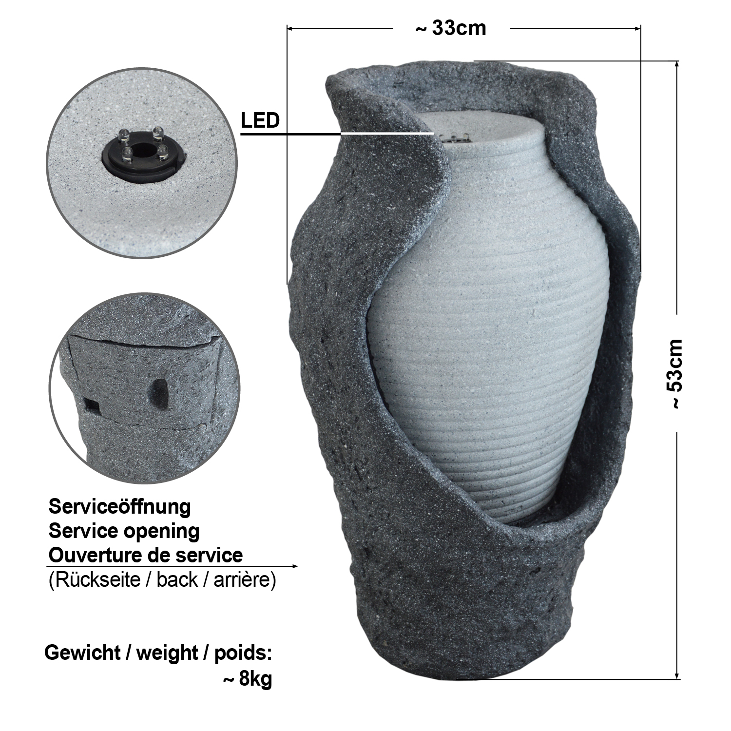 Der wirkungsvolle Zierbrunnen AMPHORE VENUS ist für den 230-Volt-Betrieb vorgesehen. Die Pumpe und die LEDs werden mit sicherer 12V-Niederspannung betrieben (Adapter im Lieferumfang enthalten). Alle Kabelverbindungen sind verpolungssicher, wasserdicht und absolut funktionssicher. Dank praktischer Steckverbindungen sind alle Komponenten jederzeit austauschbar. So können Sie den Wasserbrunnen AMPHORE VENUS und das fließende Wasser jahrelang genießen!