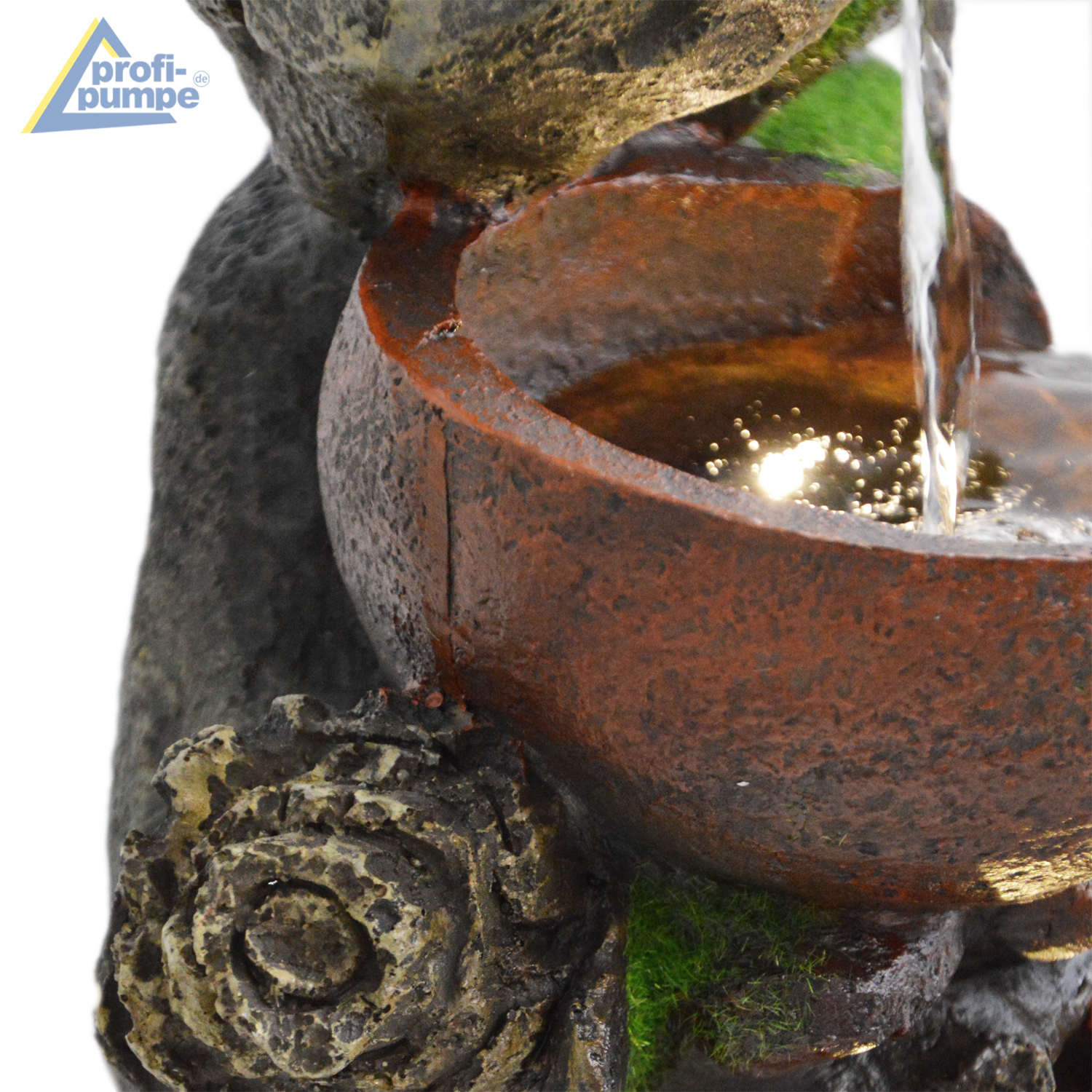 Der Gartenbrunnen ist sowohl bei Tag als auch bei Nacht der perfekte Blickfang. Die mitgelieferte LED-Beleuchtung sorgt für die perfekte Illumination. Die austauschbaren LED-Lichter erstrahlen in einem warmen Weiß.