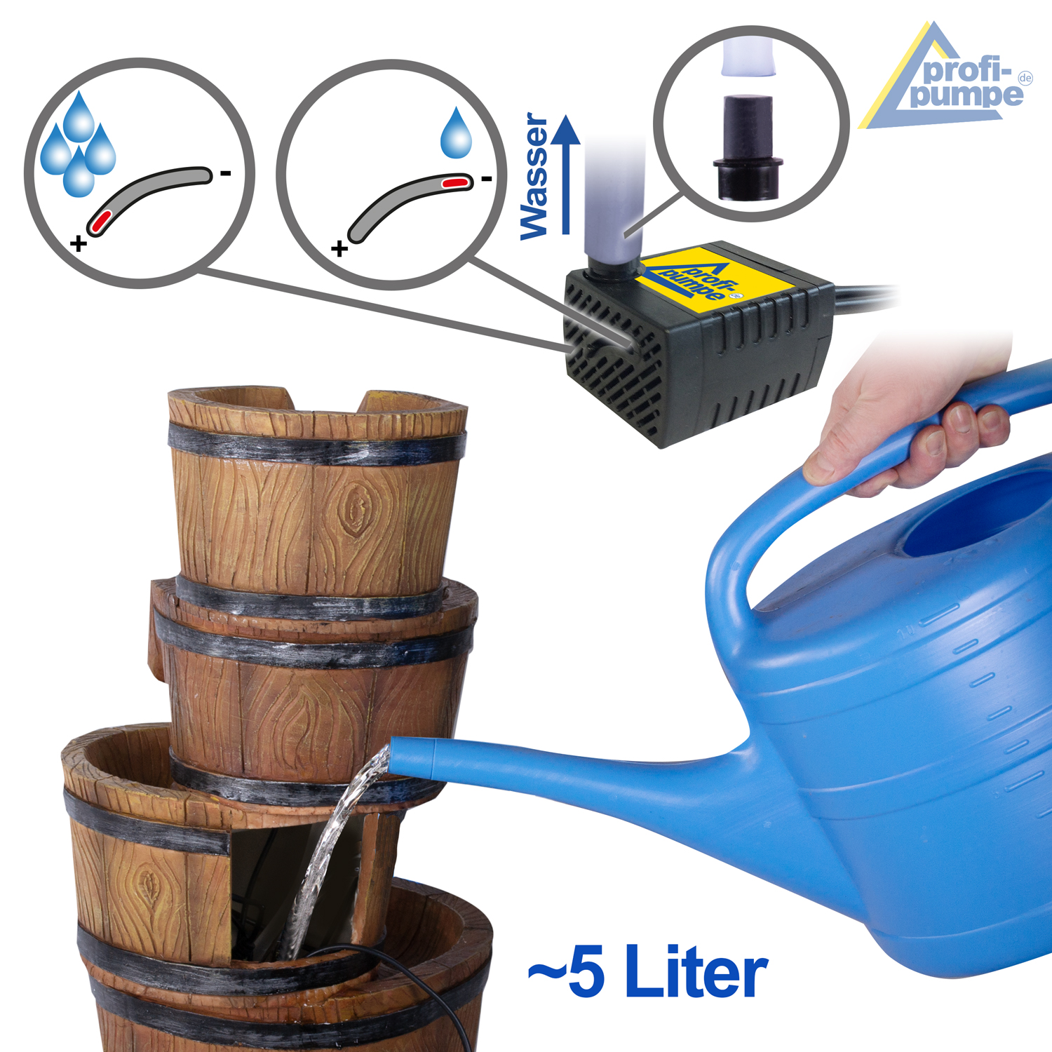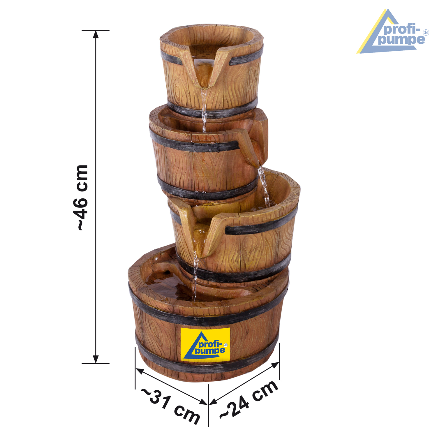 Der Brunnen HOLZ-KRUG mit 3 austauschbaren LED-Lichtern (3*1) ist für den Innen- und Außenbereich geeignet. Betrieben wird der stilvolle Wasserbrunnen mit einem 230/12-Volt Netzadapter. Mit den naturgetreuen Holzkrügen sorgt der Gartenbrunnen für eine harmonische Atmosphäre. Das Lebenselixier Wasser belebt Wohnzimmer, Esszimmer, Flure und Eingangsbereiche, Wintergärten oder Balkone, Terrassen und Gärten im privaten wie gewerblichen Umfeld.