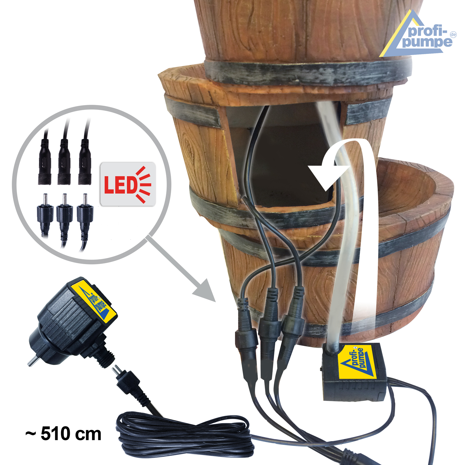 Der Wasserbrunnen ist für den 230-Volt-Betrieb vorgesehen. Die Pumpe und die LEDs werden mit sicherer 12V-Niederspannung betrieben (Adapter im Lieferumfang enthalten). Alle Kabelverbindungen sind verpolungssicher, wasserdicht und absolut funktionssicher. Dank praktischer Steckverbindungen sind alle Komponenten jederzeit austauschbar. So können Sie den Wasserbrunnen mit der effektvollen LED-Beleuchtung und das fließende Wasser jahrelang genießen!