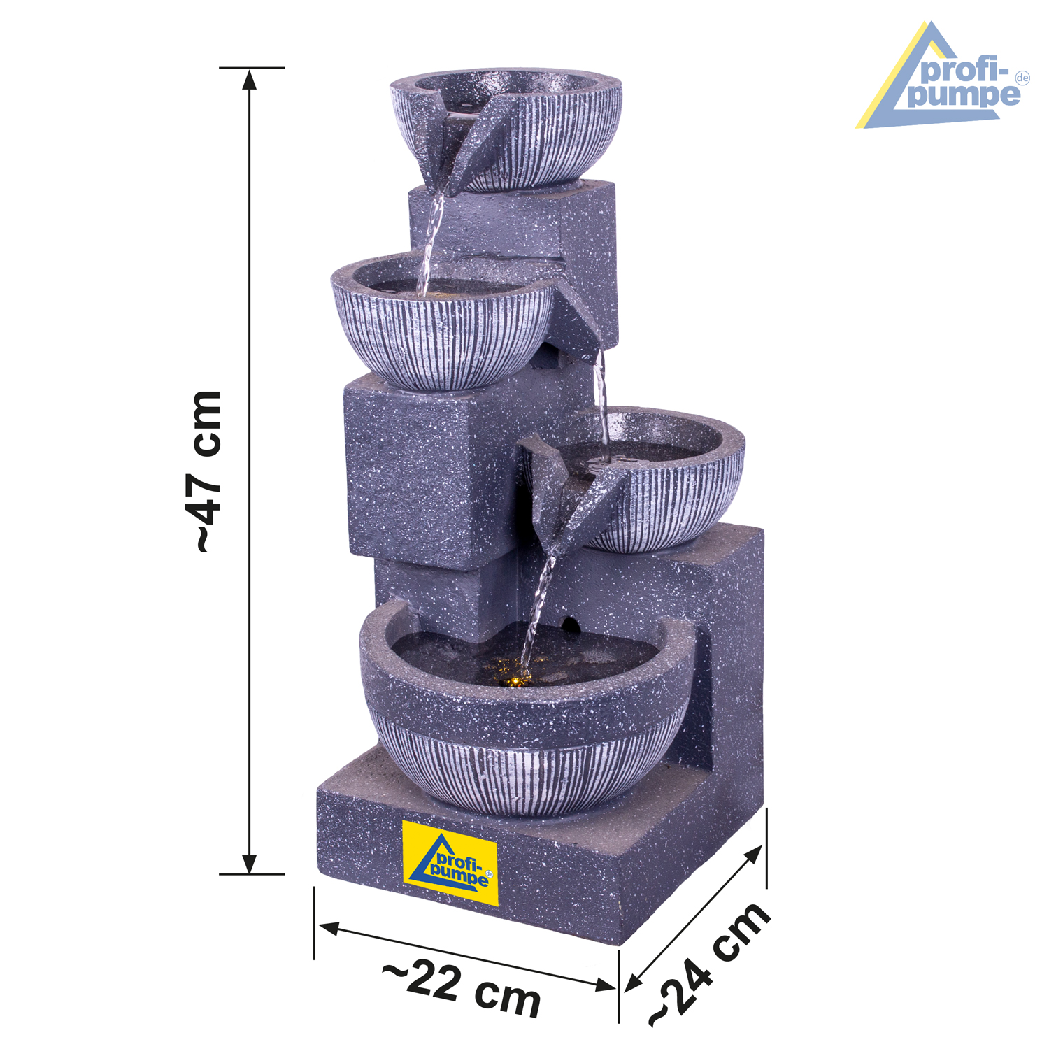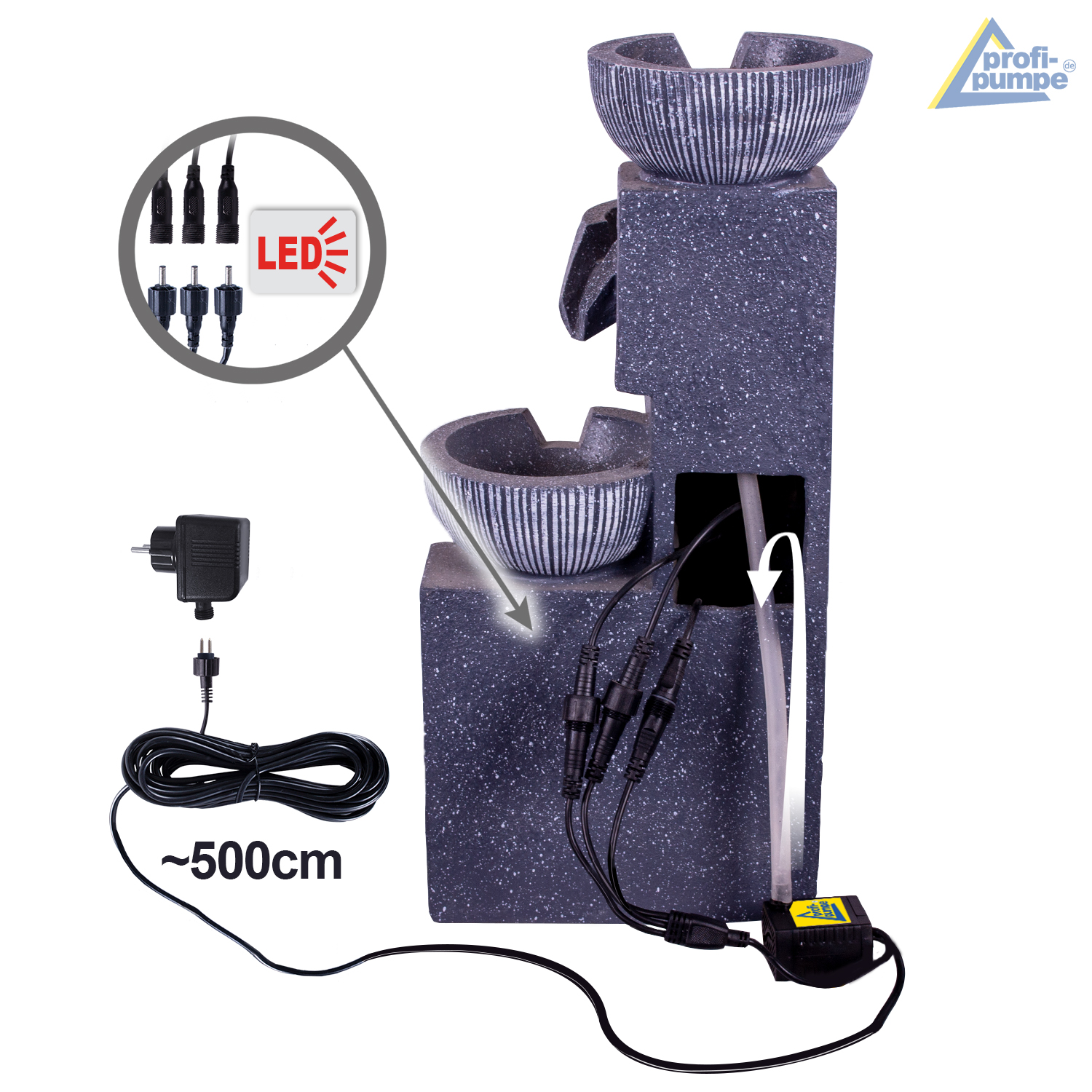 Der Wasserbrunnen ist für den 230-Volt-Betrieb vorgesehen. Die Pumpe und die LEDs werden mit sicherer 12V-Niederspannung betrieben (Adapter im Lieferumfang enthalten). Alle Kabelverbindungen sind verpolungssicher, wasserdicht und absolut funktionssicher. Dank praktischer Steckverbindungen sind alle Komponenten jederzeit austauschbar. So können Sie den Wasserbrunnen mit der effektvollen LED-Beleuchtung und das fließende Wasser jahrelang genießen!