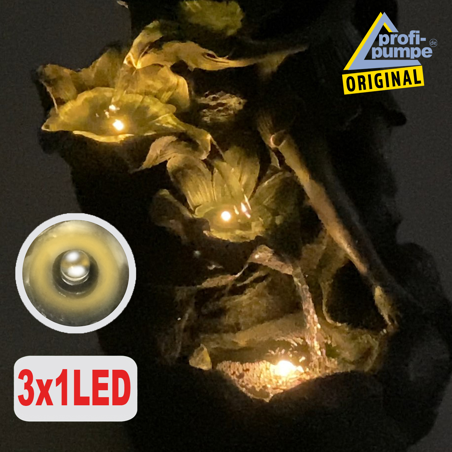 Gartenbrunnen “BLÜTEN-FEE” mit LED-Ring (3×1 LED) und 230/12V-Netzadapter. Für den Innen- und Außenbereich.