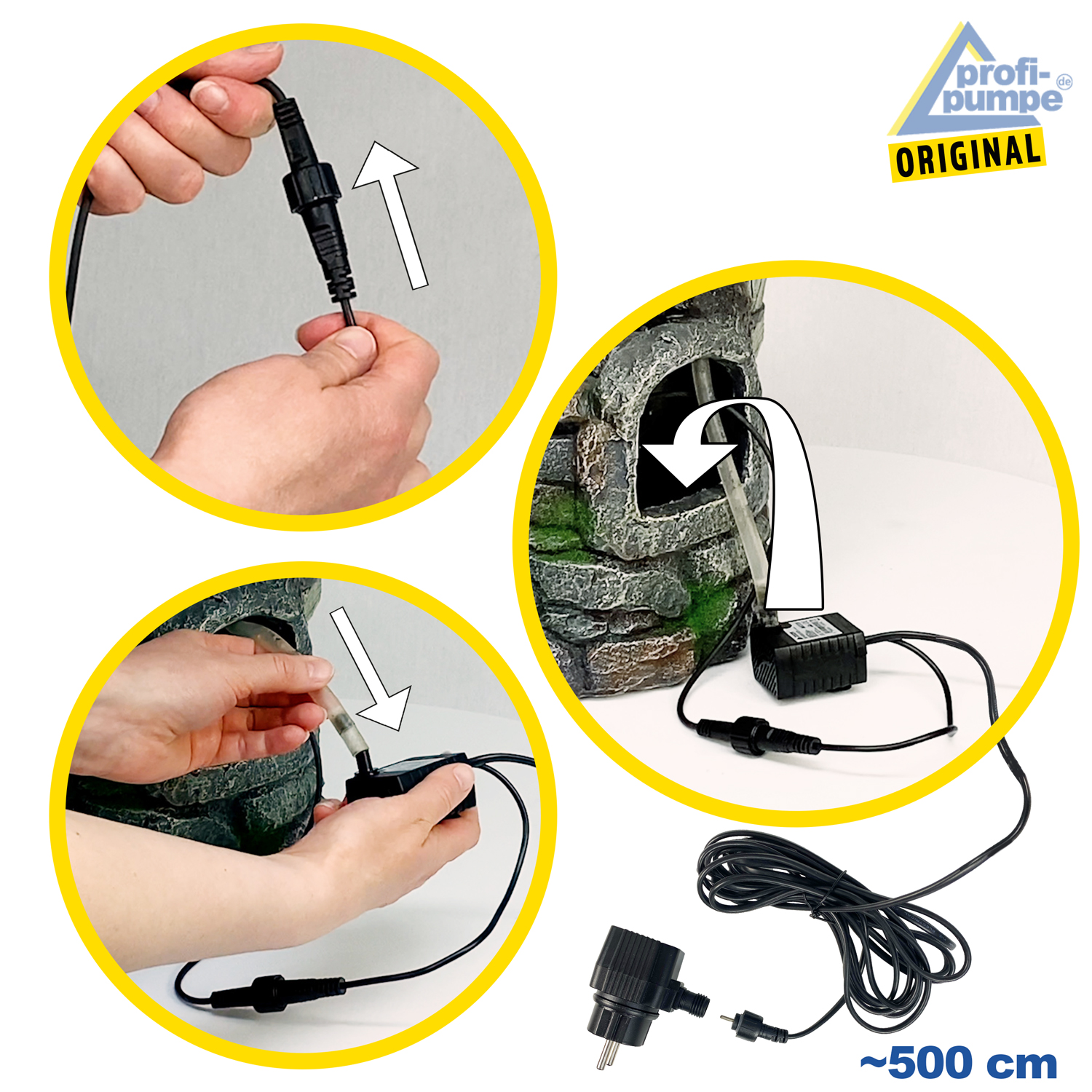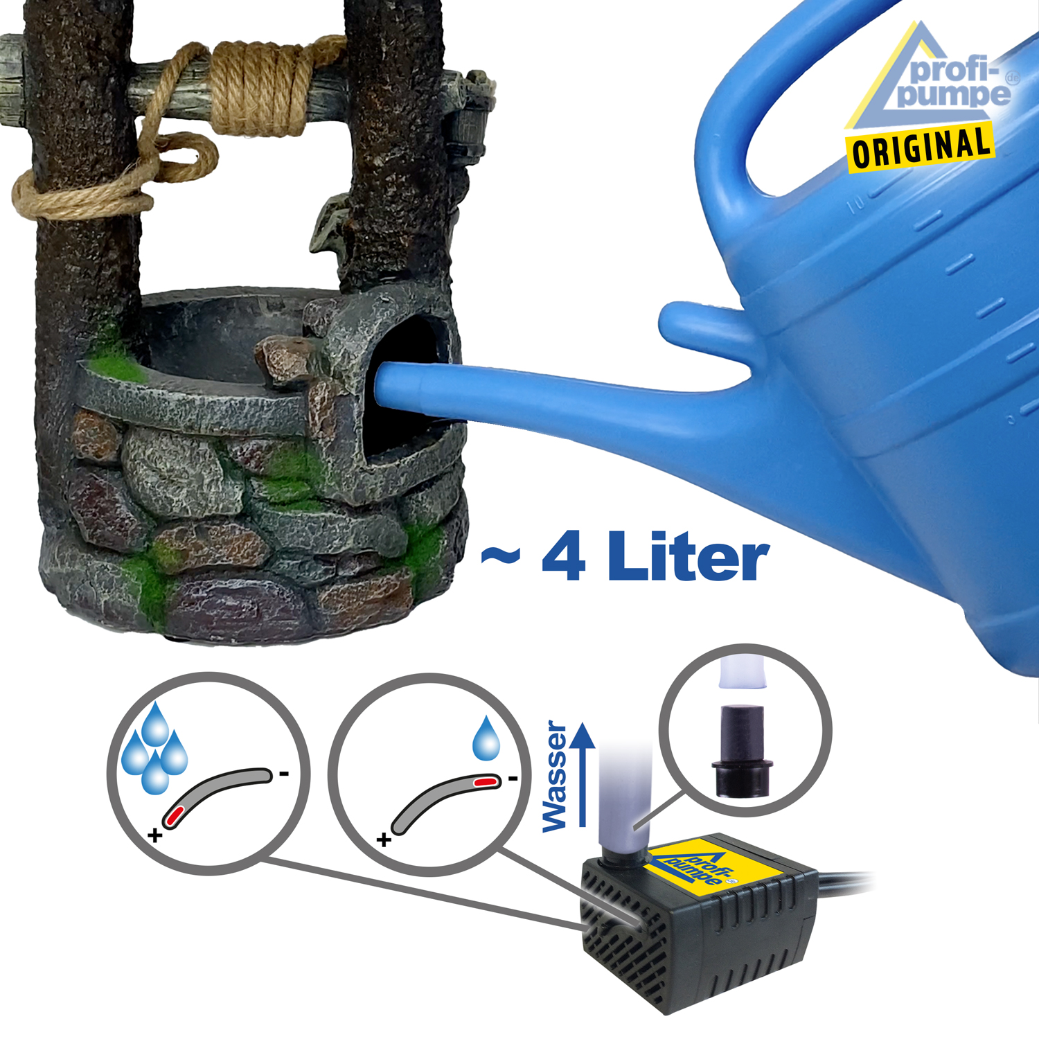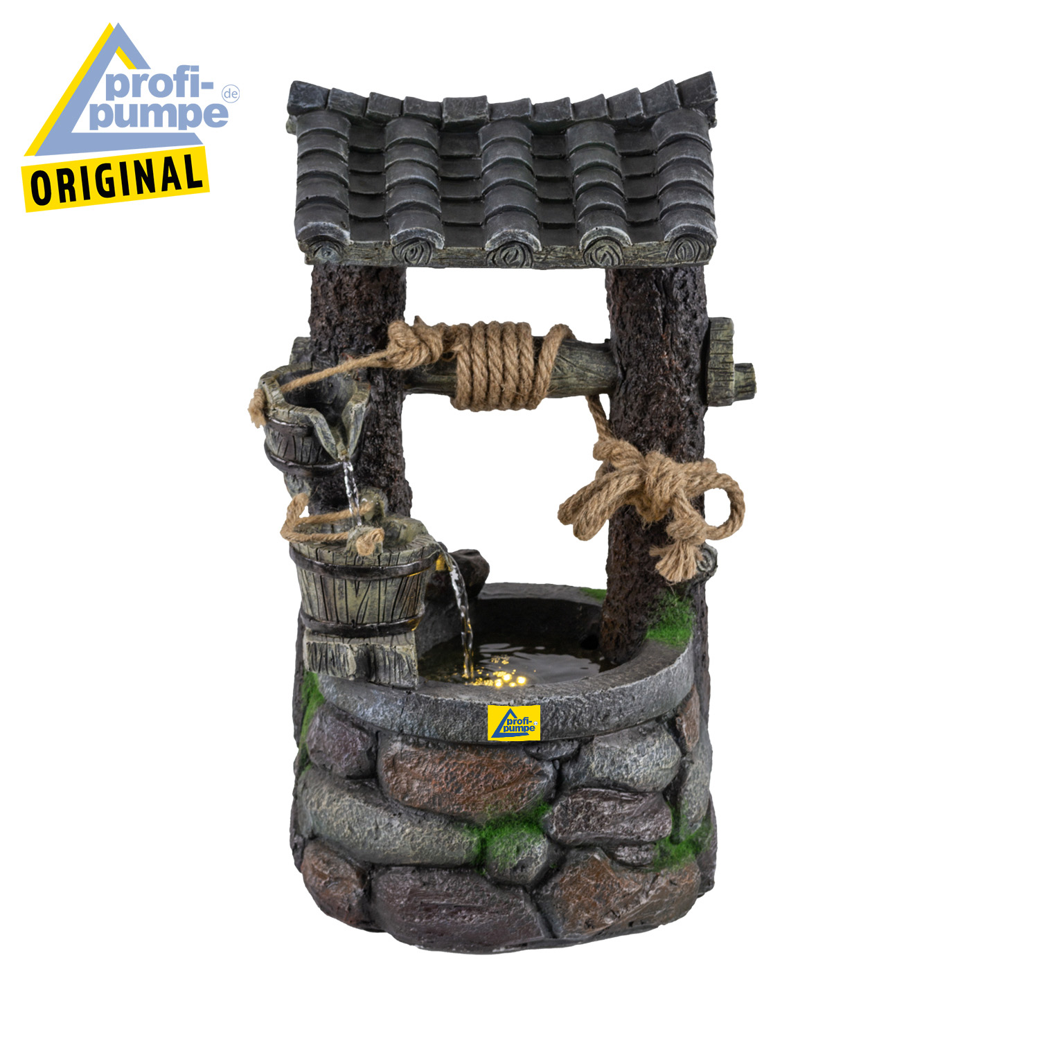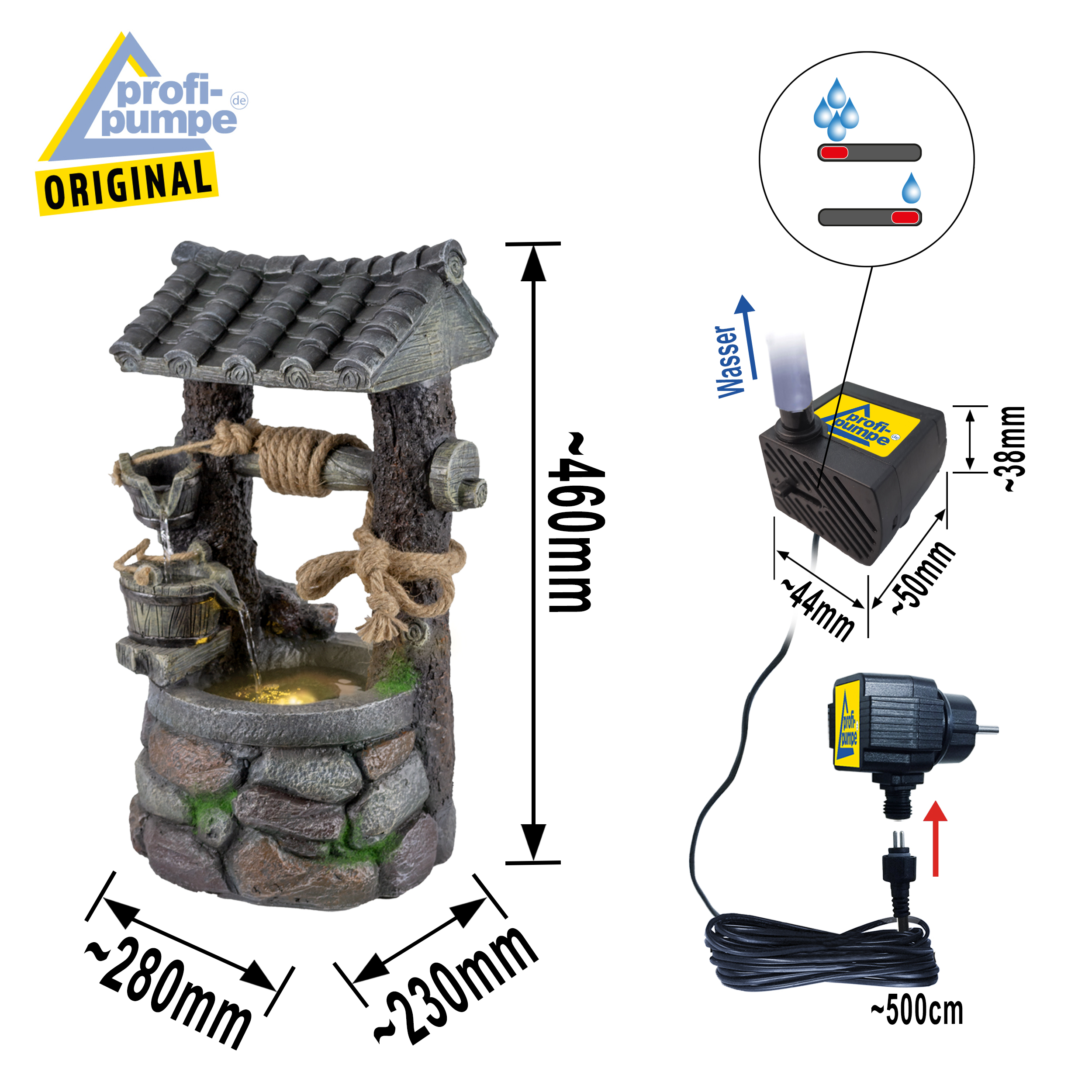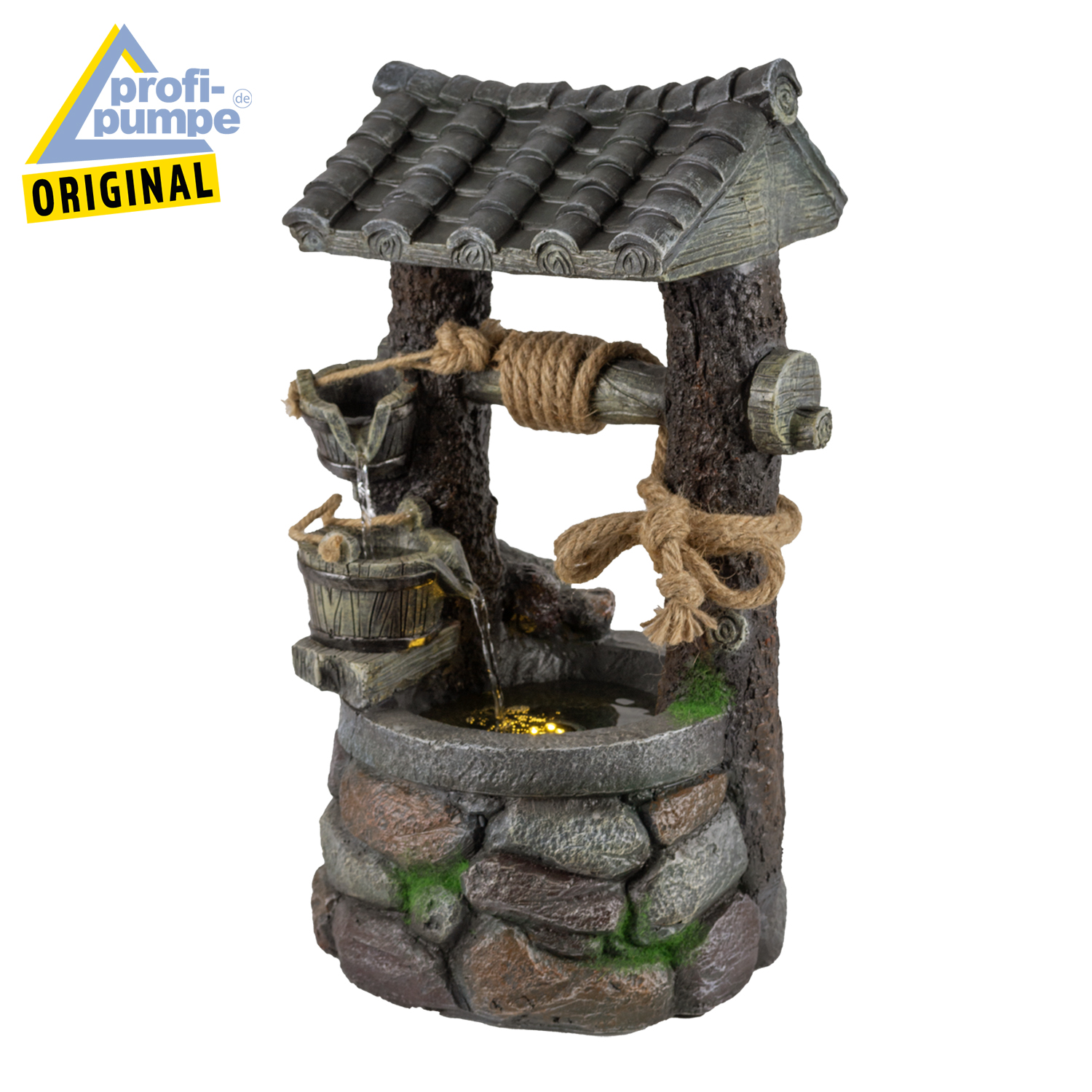 Der rustikale Zierbrunnen “MÄRCHEN-BRUNNEN” ist für den 230-Volt-Betrieb vorgesehen. Die Pumpe und die LEDs werden mit sicherer 12V-Niederspannung betrieben (Adapter im Lieferumfang enthalten). Alle Kabelverbindungen sind verpolungssicher, wasserdicht, absolut funktionssicher. Dank praktischer Steckverbindungen sind alle Komponenten jederzeit austauschbar. So können Sie den Wasserbrunnen “MÄRCHEN-BRUNNEN” und das fließende Wasser jahrelang genießen!