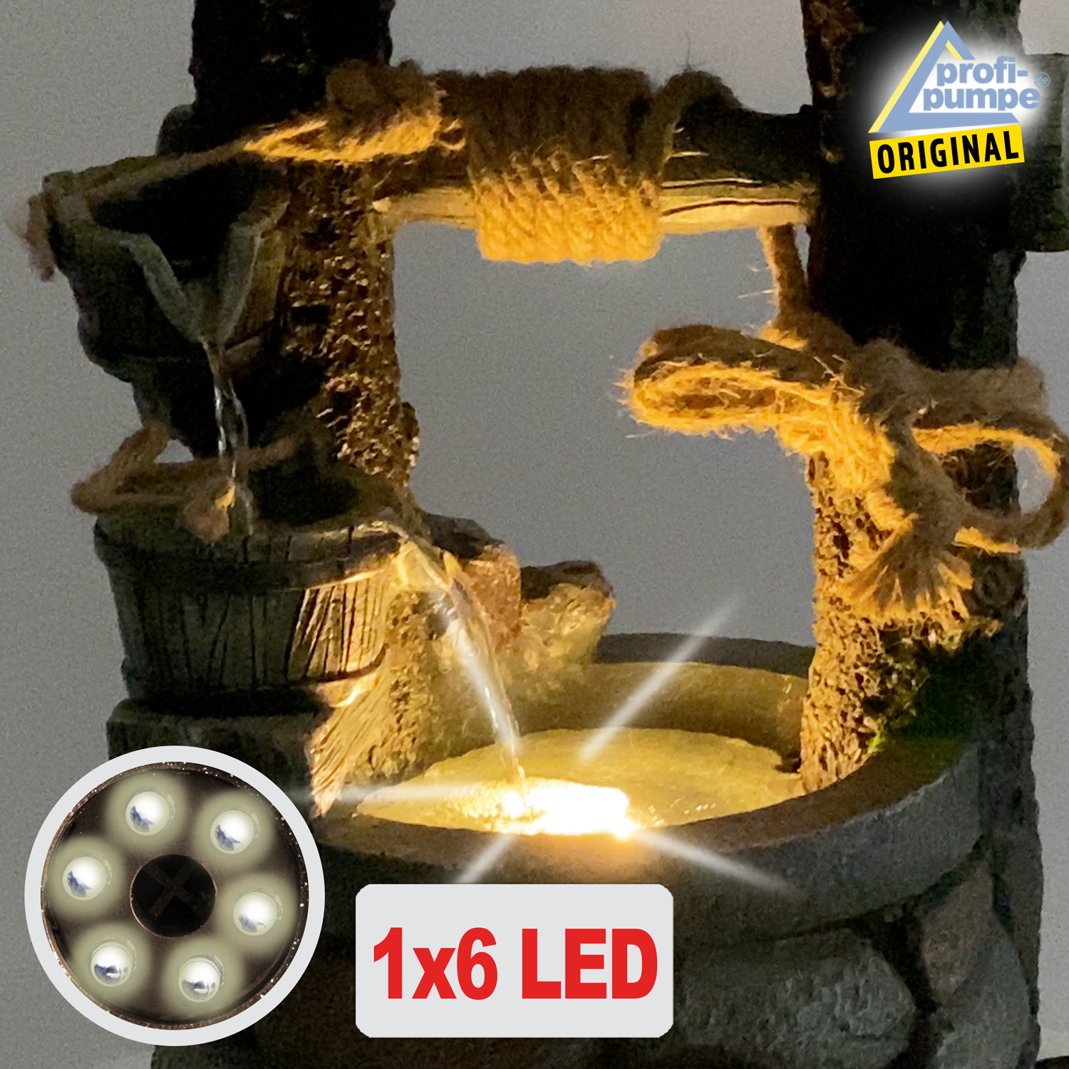 Der Gartenbrunnen ist sowohl bei Tag als auch bei Nacht der perfekte Blickfang. Die mitgelieferte LED-Beleuchtung sorgt für die perfekte Illumination. Die LED-Lichter des LED-Rings erstrahlen in einem warmen Weiß.