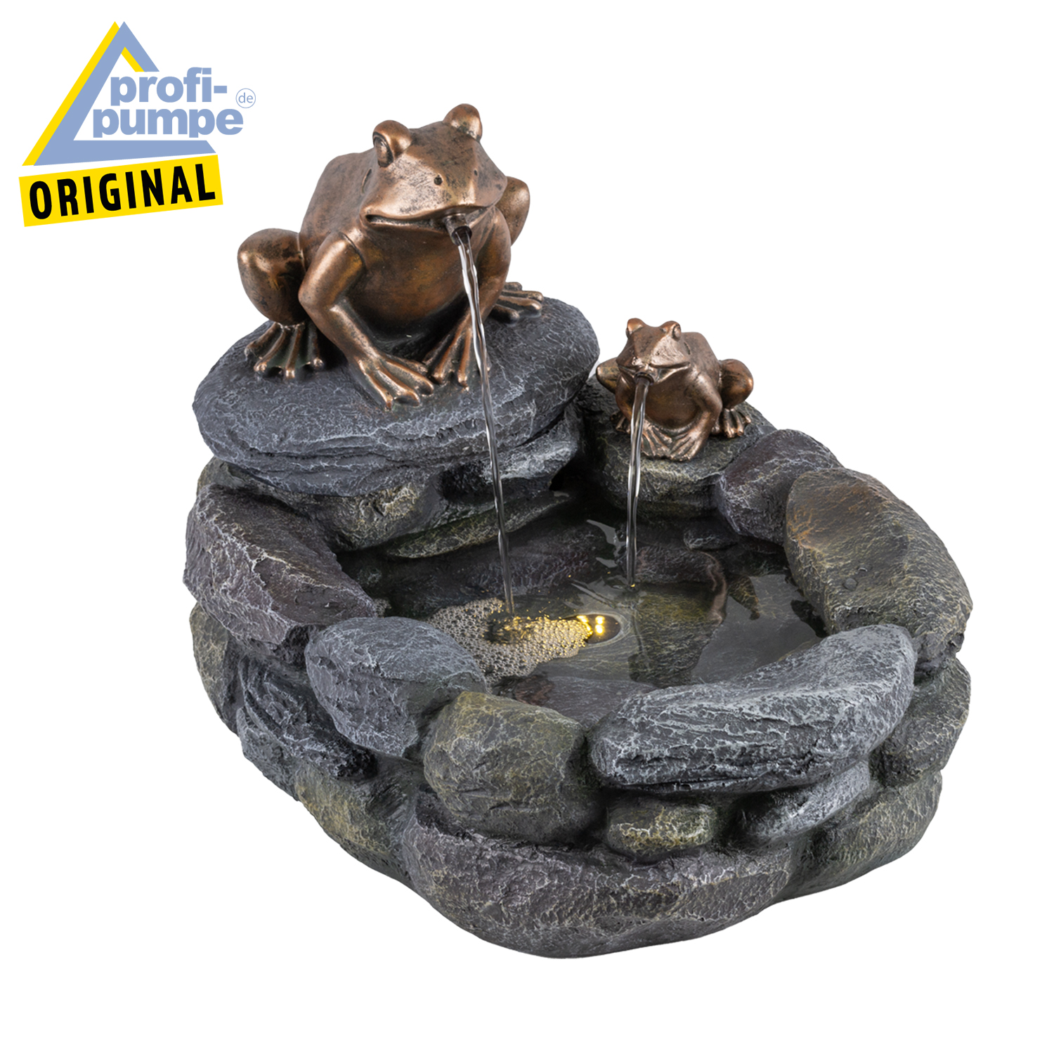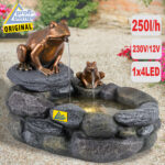 Ein großer und ein kleiner Frosch sitzen am Rande eines Felsen-Beckens und speien Wasser in die Tiefe. Der 230V – Gartenbrunnen & Wasserspiel “TEICH-KÖNIG” mit LED-Licht ist für den Innen- und Außenbereich geeignet. Betrieben wird der Garten- und Zimmerbrunnen mit einem 230/12-Volt Netzadapter. Mit der Stein-Dekoration sorgt der Zierbrunnen für eine naturnahe Atmosphäre und Entspannung. Ganz gleich, wo der In- und Outdoor-Brunnen aufgestellt wird – dieser wassersprudelnde Blickfang wertet jeden Standort auf. Das Lebenselixier Wasser belebt Wohnzimmer, Esszimmer, Flure und Eingangsbereiche, Wintergärten oder Balkone, Terrassen und Gärten im privaten wie gewerblichen Umfeld.