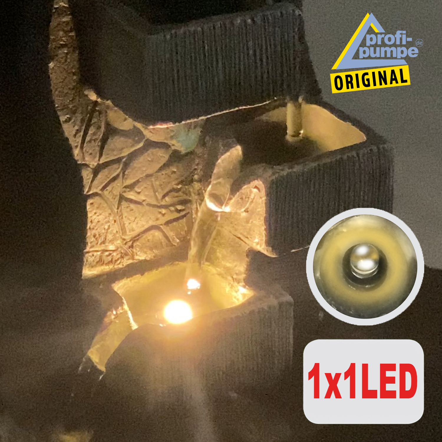 Der Zimmerbrunnen ist sowohl bei Tag als auch bei Nacht der perfekte Hingucker. Die mitgelieferte LED-Beleuchtung sorgt für die perfekte Illumination. Das LED-Licht erstrahlt in einem warmen Weiß.