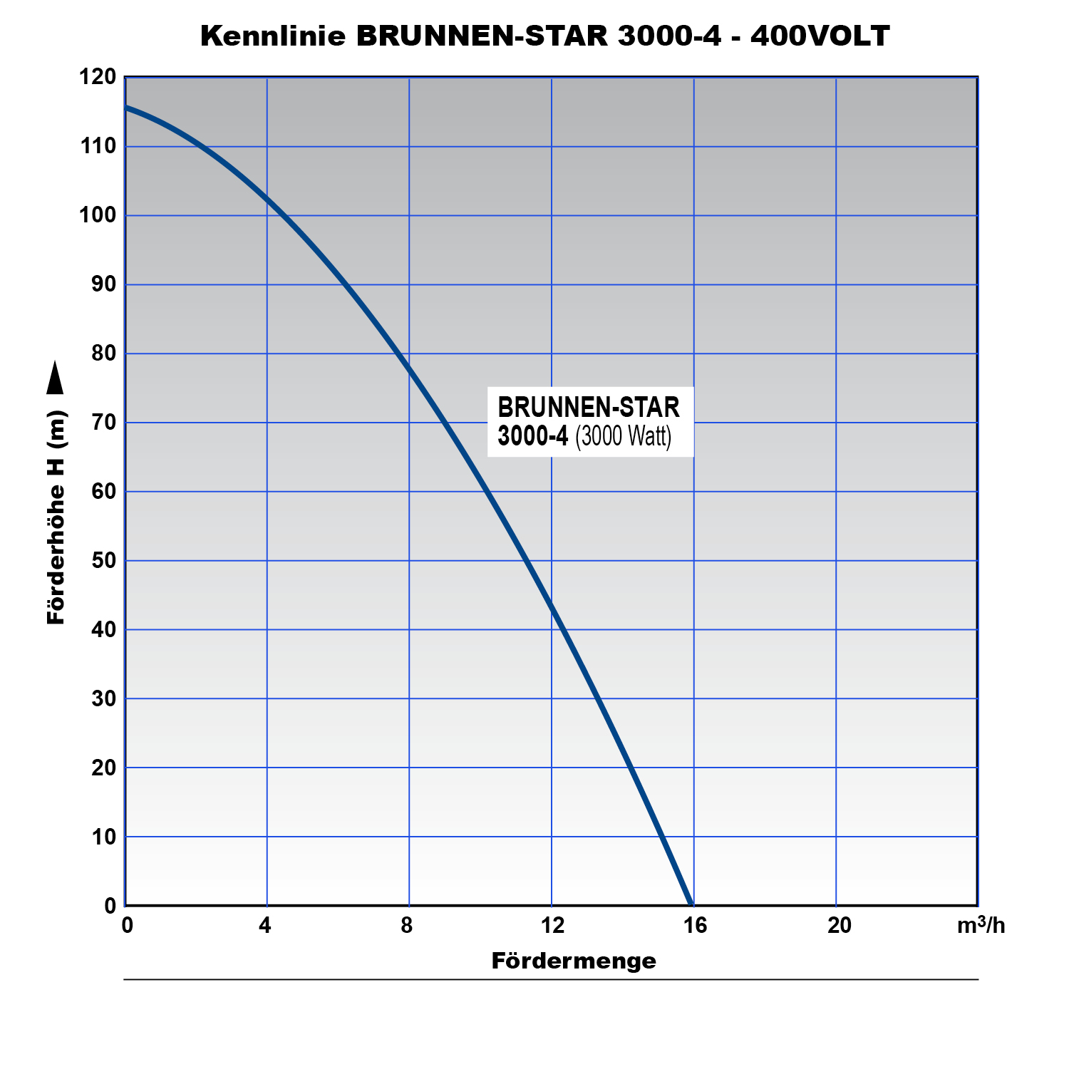 Die leistungsstarke Tiefbrunnenpumpe hat einen hochwertigen gekapselten Motor und erbringt Fördermenge von bis zu 16.000l/h. Die maximale Förderhöhe beträgt 116m und der maximale Förderdruck liegt bei 11,6bar. Bitte beachten Sie, dass die Förderleistung bei steigender Förderhöhe entsprechend abnimmt.