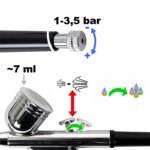Sprühpistolen, bei denen die Farbzuführung von oben erfolgt, nennt man auch “Gravity”. Bauartbedingt haben diese Spritzpistolen meist einen festen oder gar keinen Farbbehälter oder eine (Farbmulde) von geringer Größe. Die Farbe gelangt hier direkt in den Nadelschaft und in die Düse. Die 0,3mm Düse gestattet Arbeiten bis auf Haarliniengenauigkeit aber auch groberpixelige Einsätze.