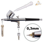 Die Airbrush-Pistole “Double-Action-Gun 130 D 0,3” ist ein Zweistoff-Zerstäuber, der nach dem Prinzip einer Strahlpumpe arbeitet, wobei Druckluft als Treibmittel verwendet wird. In Abhängigkeit von der Stärke des Luftstroms und der Menge der Farbe, kann man mit einer Airbushpistole feinste Linien aber auch große Flächen malen. Man kann Farbe deckend aufsprühen aber auch einen transparenten Farbfilm airbrushen.