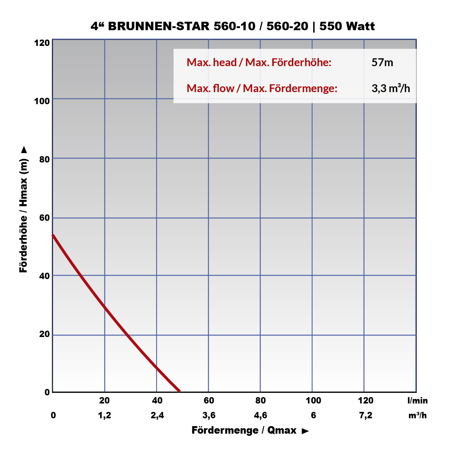 Diese BRUNNEN-STAR-AUTOMATIC 560-20 ohne SAND-VORFILTER erbringt eine Leistung von P2 550 Watt, P1 950 Watt. Die maximale Förderhöhe beträgt 57m,
