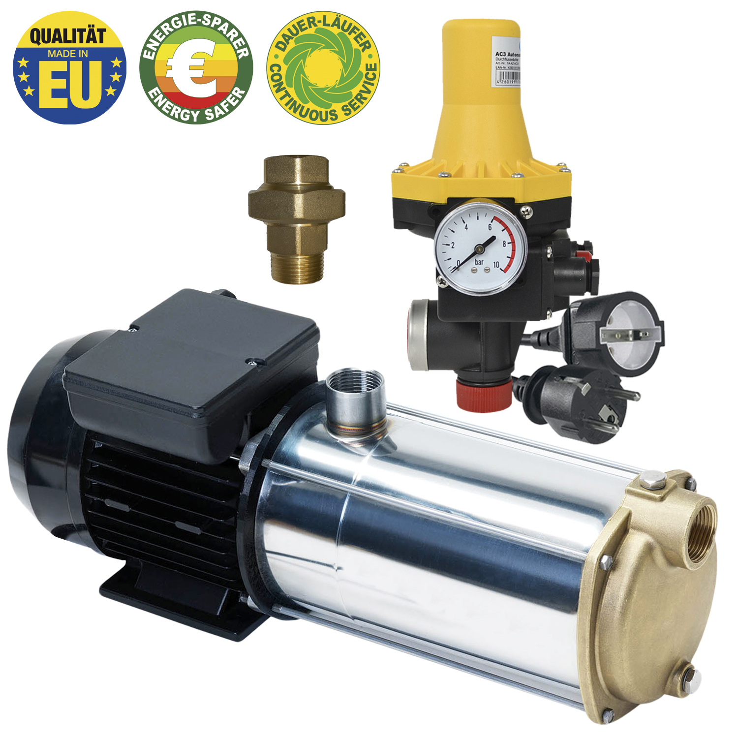 • Solide, leistungsstarke, zuverlässige,mehrstufige Kreiselpumpe 5,5 bar und Fördermenge von 6500l/h bei einer Leistungsaufnahme von 1500 W