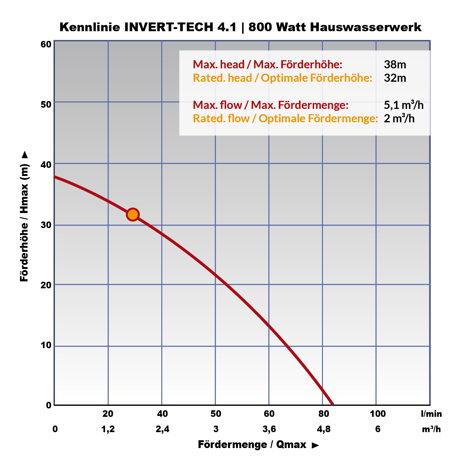 Die maximale Fördermenge beträgt 5.100 l/h, der maximale Druck liegt bei 3,8 bar und die maximale Förderhöhe 38 m.