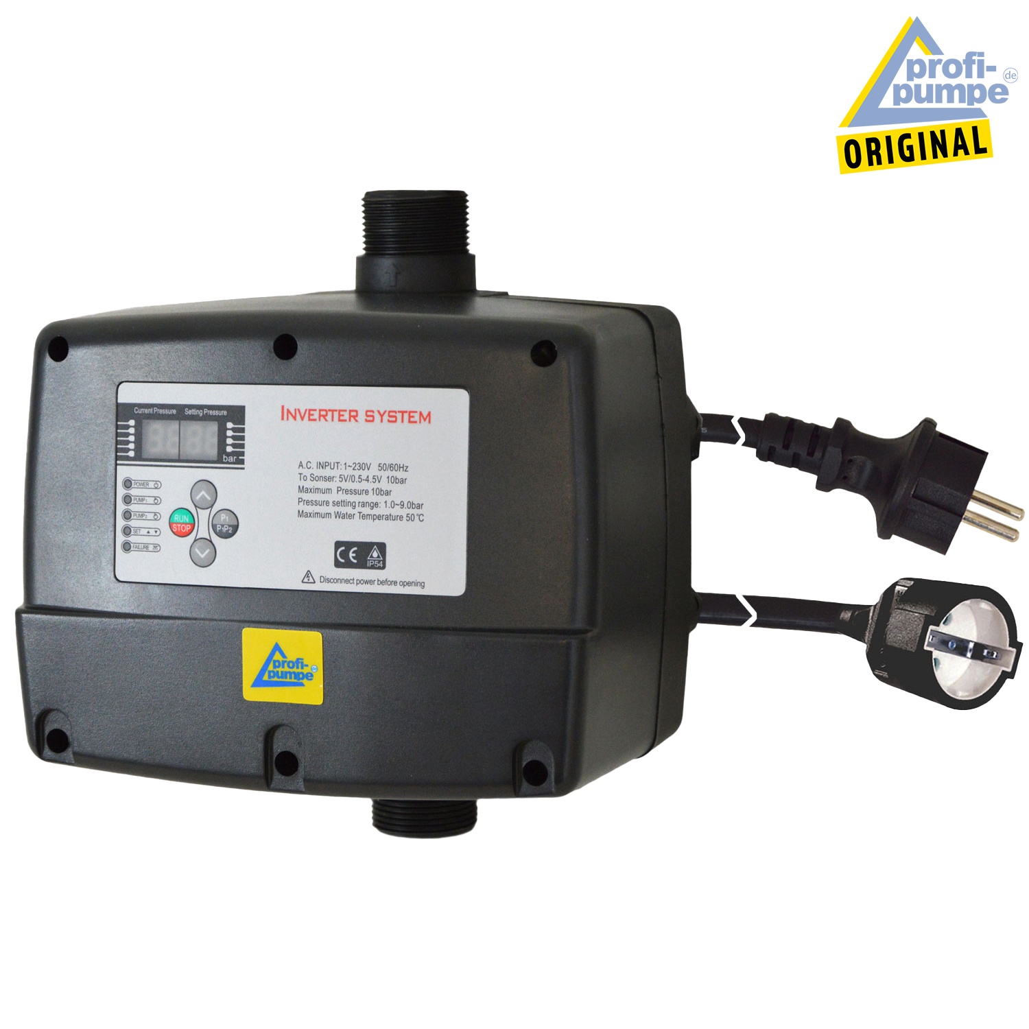 Bitte beachten: Für die richtige Funktion der INVERTER-Pumpensteuerung 3-1,5KW 1*230V, verkabelt (IPC-3-VK) MUSS ein Druckausdehnungsgefäß /Drucktank mit einem Mindestvolumen von 2L in der Druckleitung in unmittelbarer Nähe der Steuerung vorhanden sein. Bei unserer Zubehör-Auswahl können Sie für einen kleinen Aufpreis einen hochwertigen Drucktank (2 oder 8L) mitbestellen.