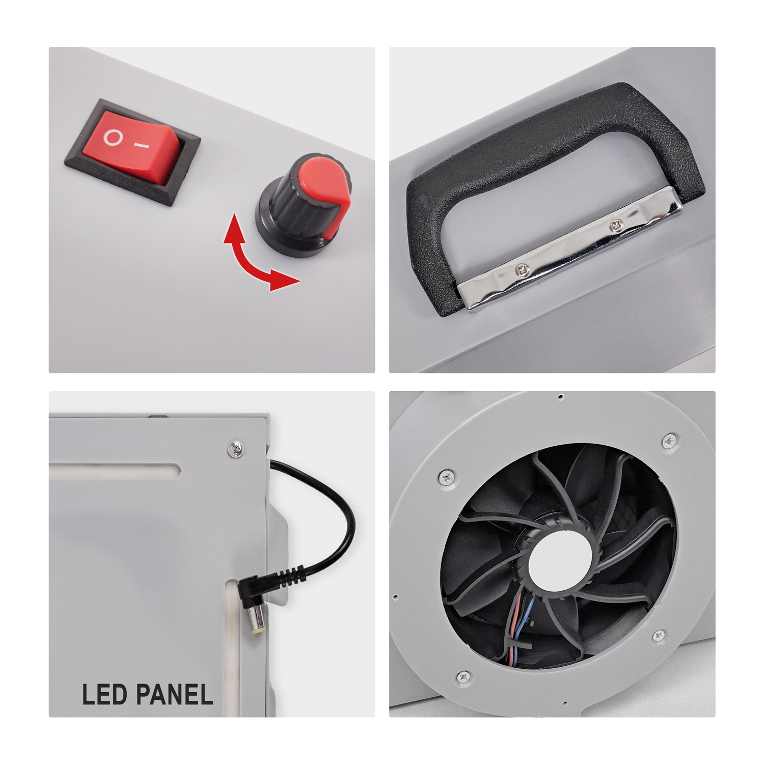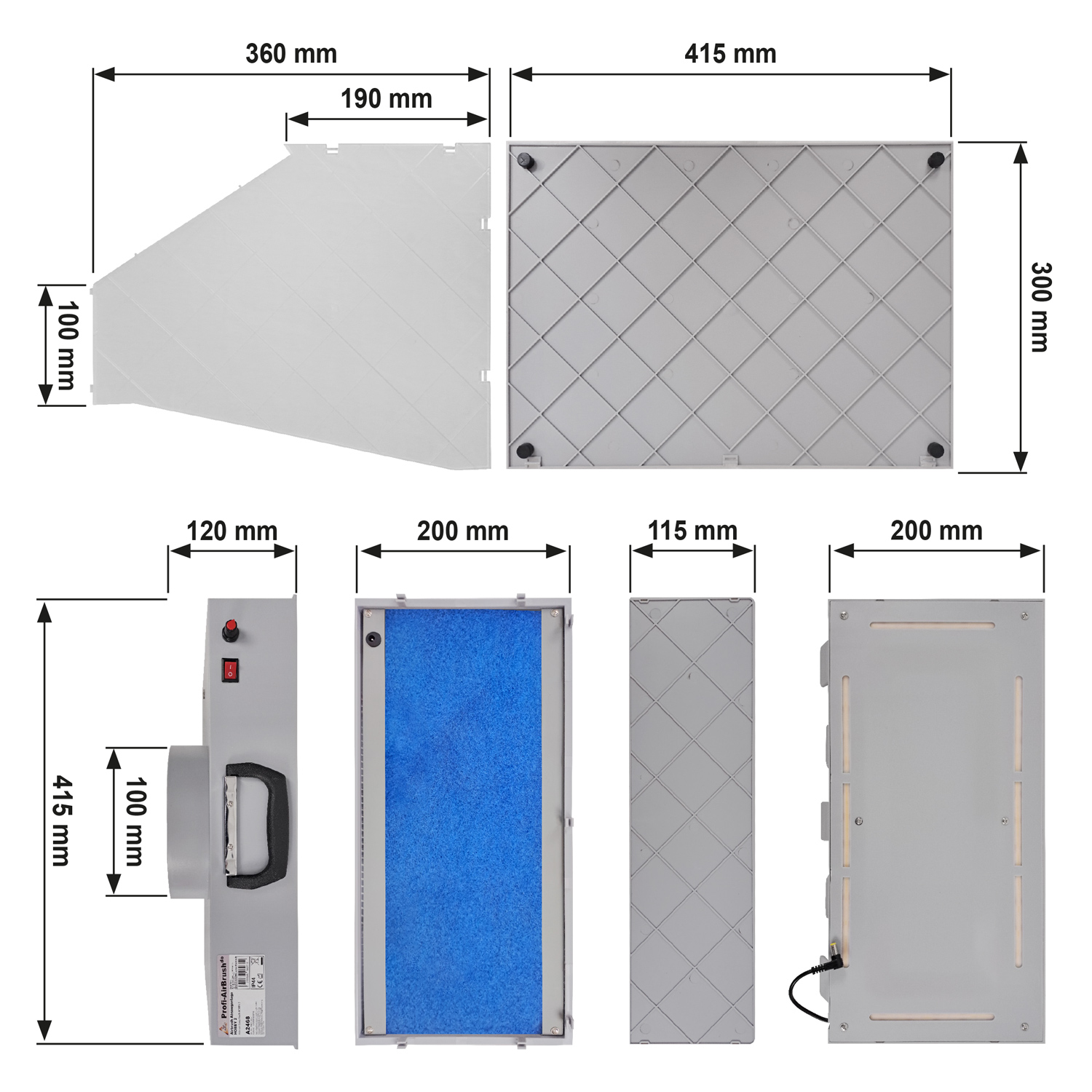 Die Absauganlage filtert den Farbdampf, Staub und andere Partikel in der Luft aus dem Arbeitsbereich und hält ihn sauber. Der Integrierte Ventilator sorgt dabe für einen Abluftstrom von bis zu 180 CFM / 5,1m³/min. Die Lüftergeschwindigkeit kann von 0 bis 5,1m³/min eingestellt werden.